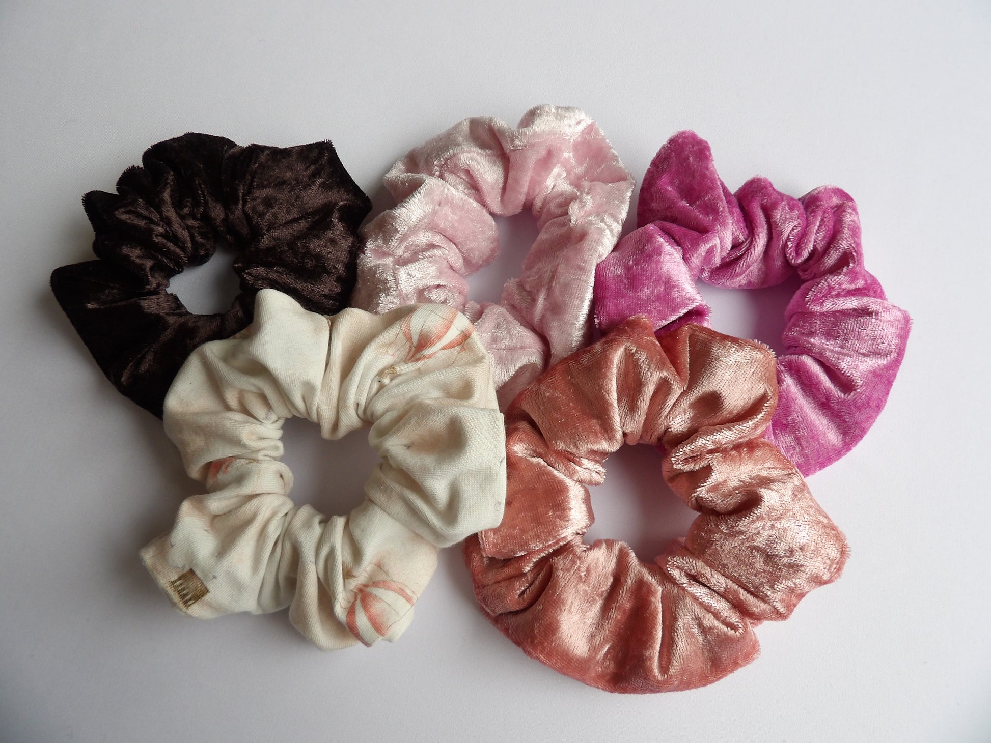 - 🎀 Four scrunchies for adults in velour fabric in different colors, where the colors are carefully selected to match the complete set.