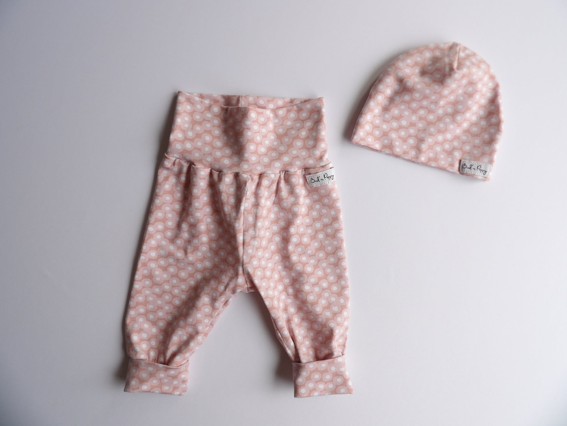 - A hat in double jersey fabric, size 36/38 (size 50). The hat is made of the same fabric as the growth pants. It is recommended that newborns wear hats outside all year round, and a hat was therefore an easy and obvious choice as part of the Bud'n Poppy Original Set.