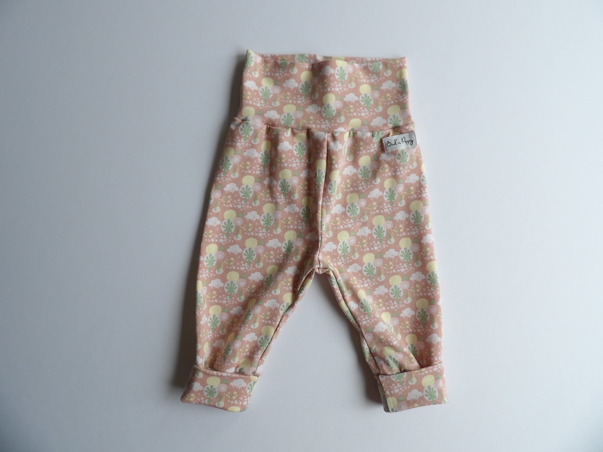 - A pair of airy and soft grow-out pants, in soft jersey fabric for baby. The pants have extra long cuffs at the waist and leg ends that can be easily folded down as the baby grows, extending the use time and providing a flexible fit.