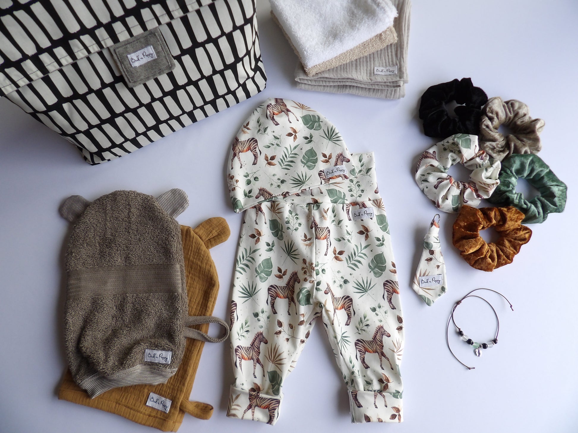 - 🎀 A matching scrunchie for adults in the same soft jersey fabric as the baby clothes.