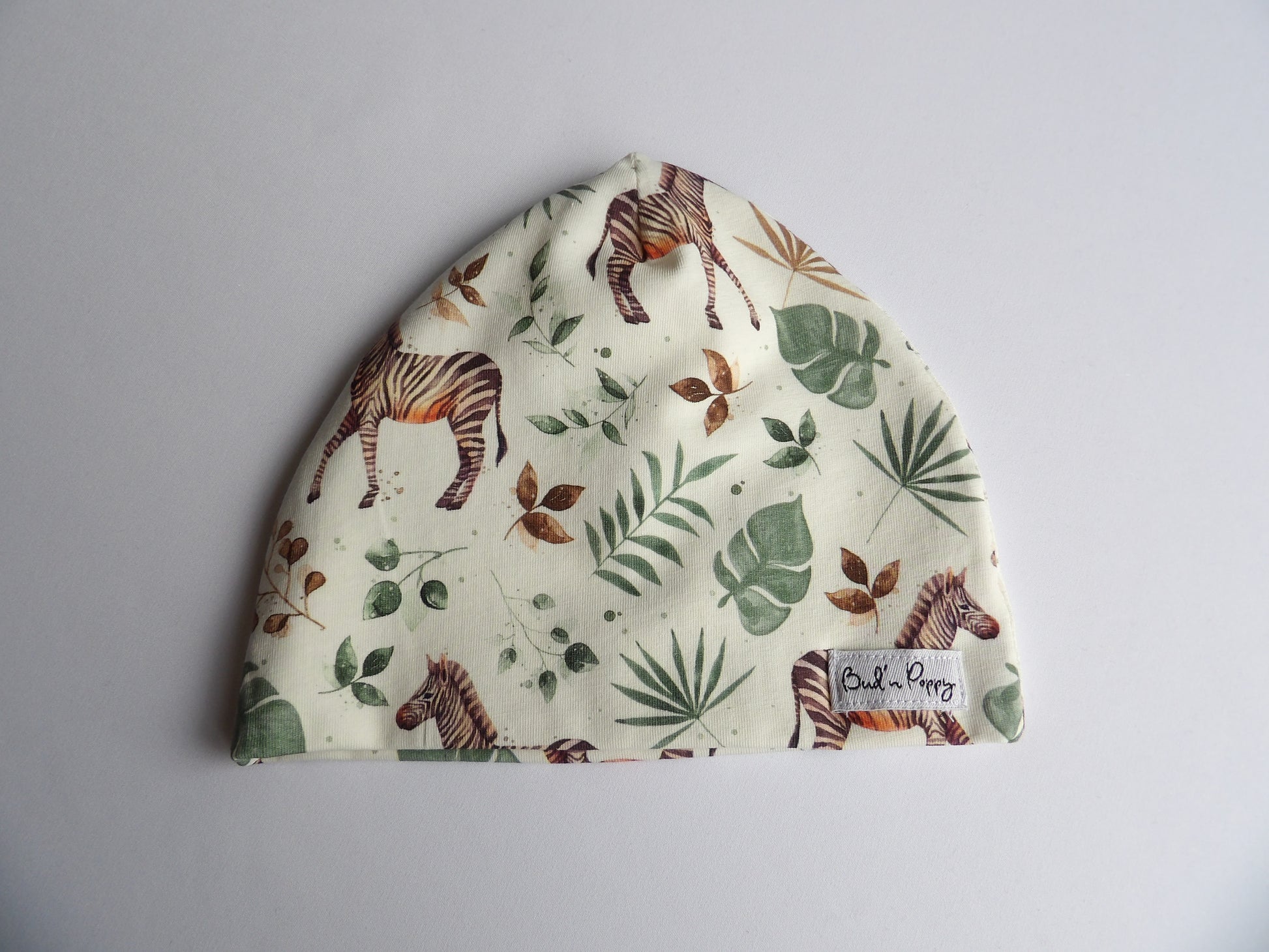 - 👶 A hat in double jersey fabric, size 40/42 (size 56). The hat is made of the same fabric as the grow-out pants. It is recommended that newborns wear hats outside all year round and a hat was therefore an easy and obvious choice as part of the Bud'n Poppys Gift Set.