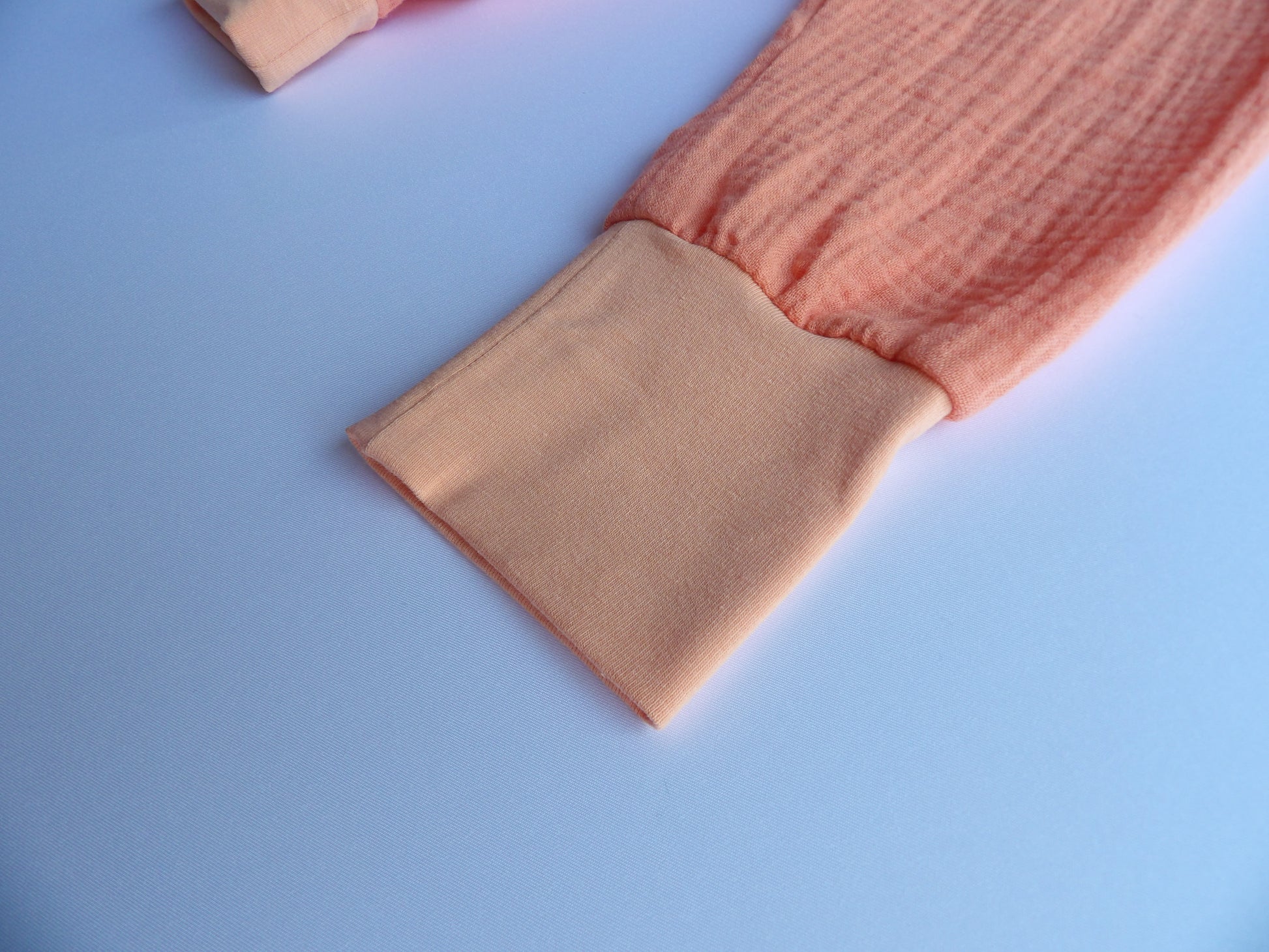- A pair of airy and soft growing pants for baby. The pants are made of Soft muslin fabric and with knit cuffs. The pants have extra long cuffs at the waist and leg ends that can be easily folded down as the baby grows, extending the wear time and providing a flexible fit.
