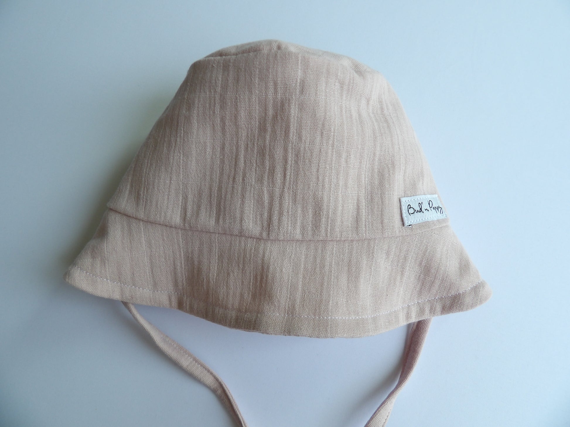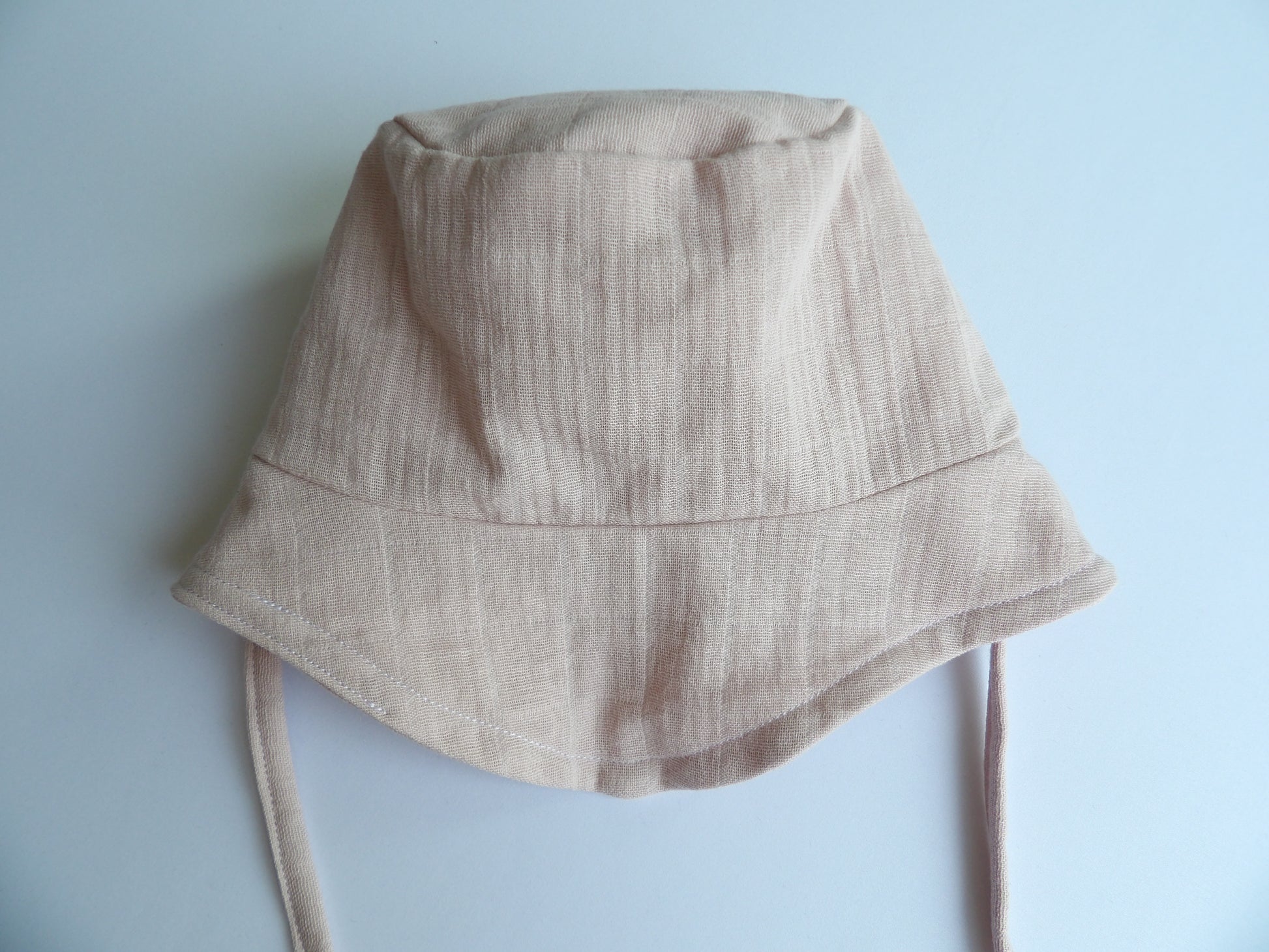 - A baby sun hat made from the same soft muslin fabric as the pants (size 74, 6-9 months). The sun hat is perfect for sunny days and is easily tied to keep it in place.