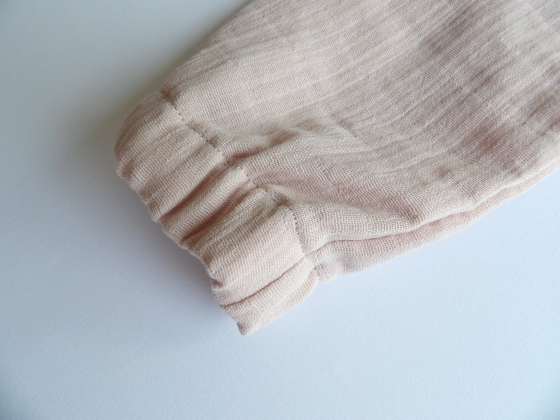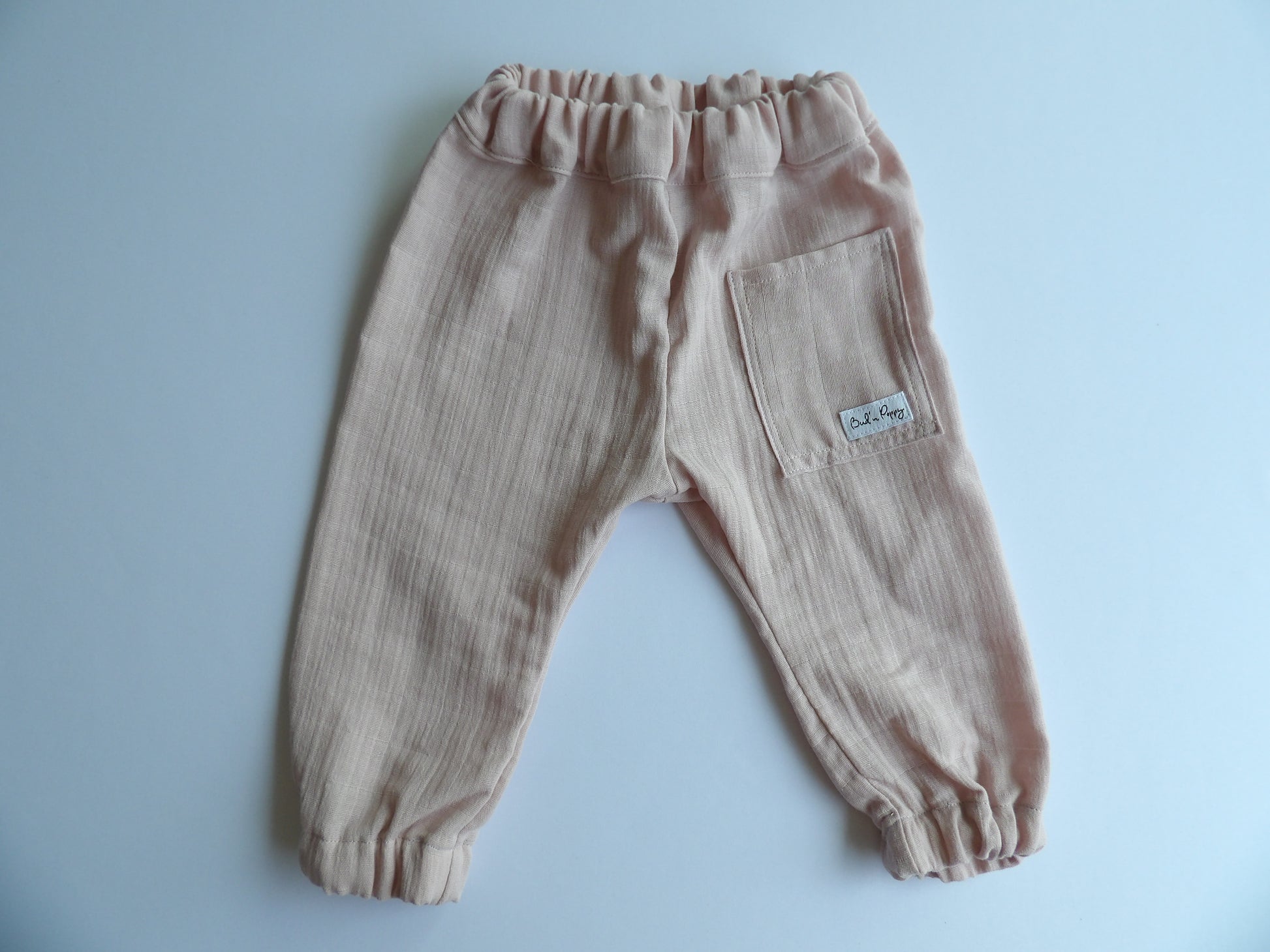 - A pair of soft muslin pants for baby. The pants are perfect for warm days and the elastic at the waist and leg ends provides a flexible and comfortable fit that keeps the pants in place.