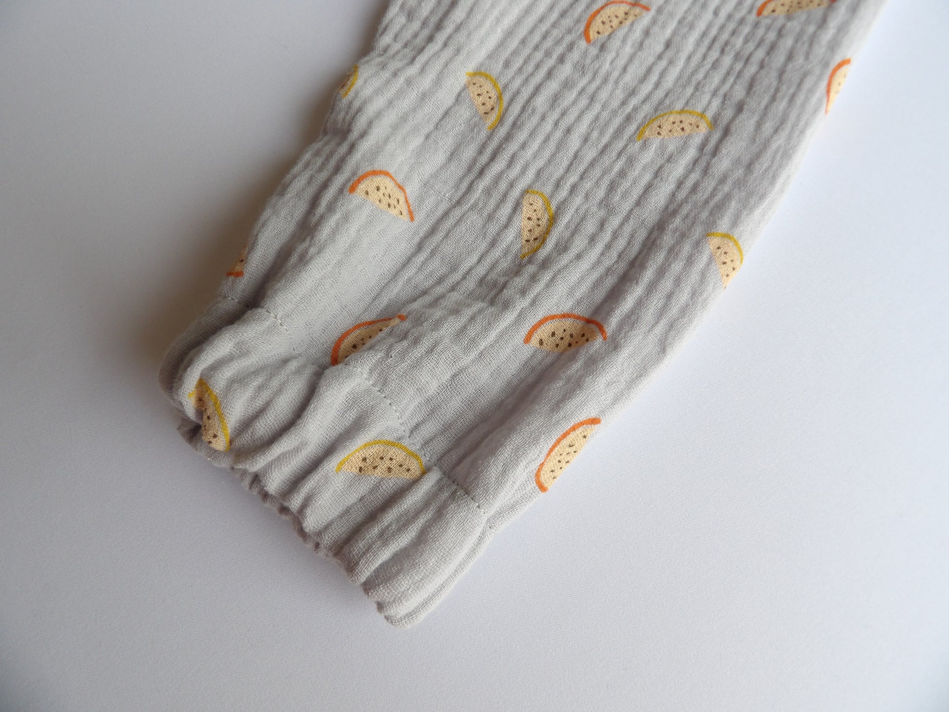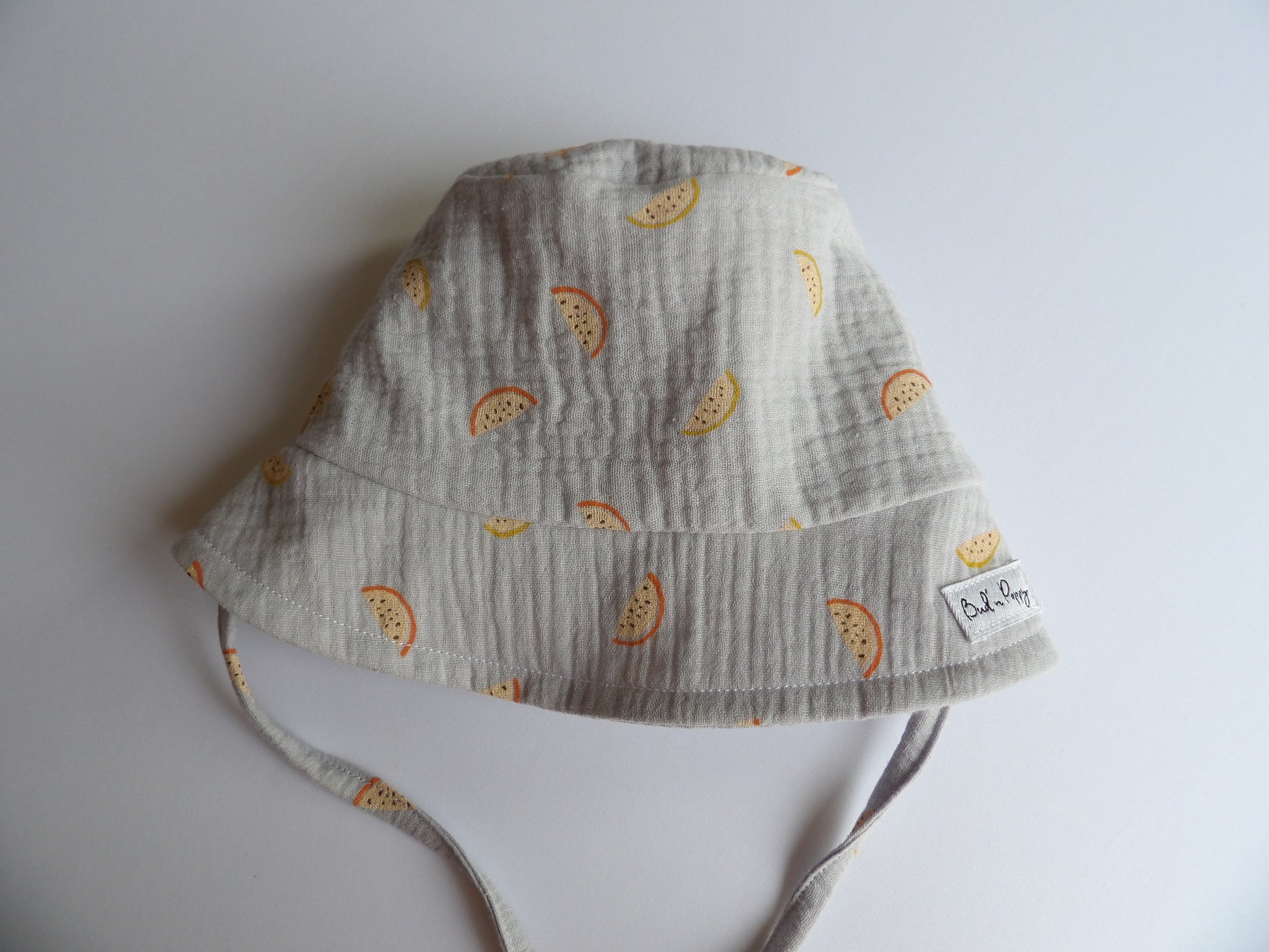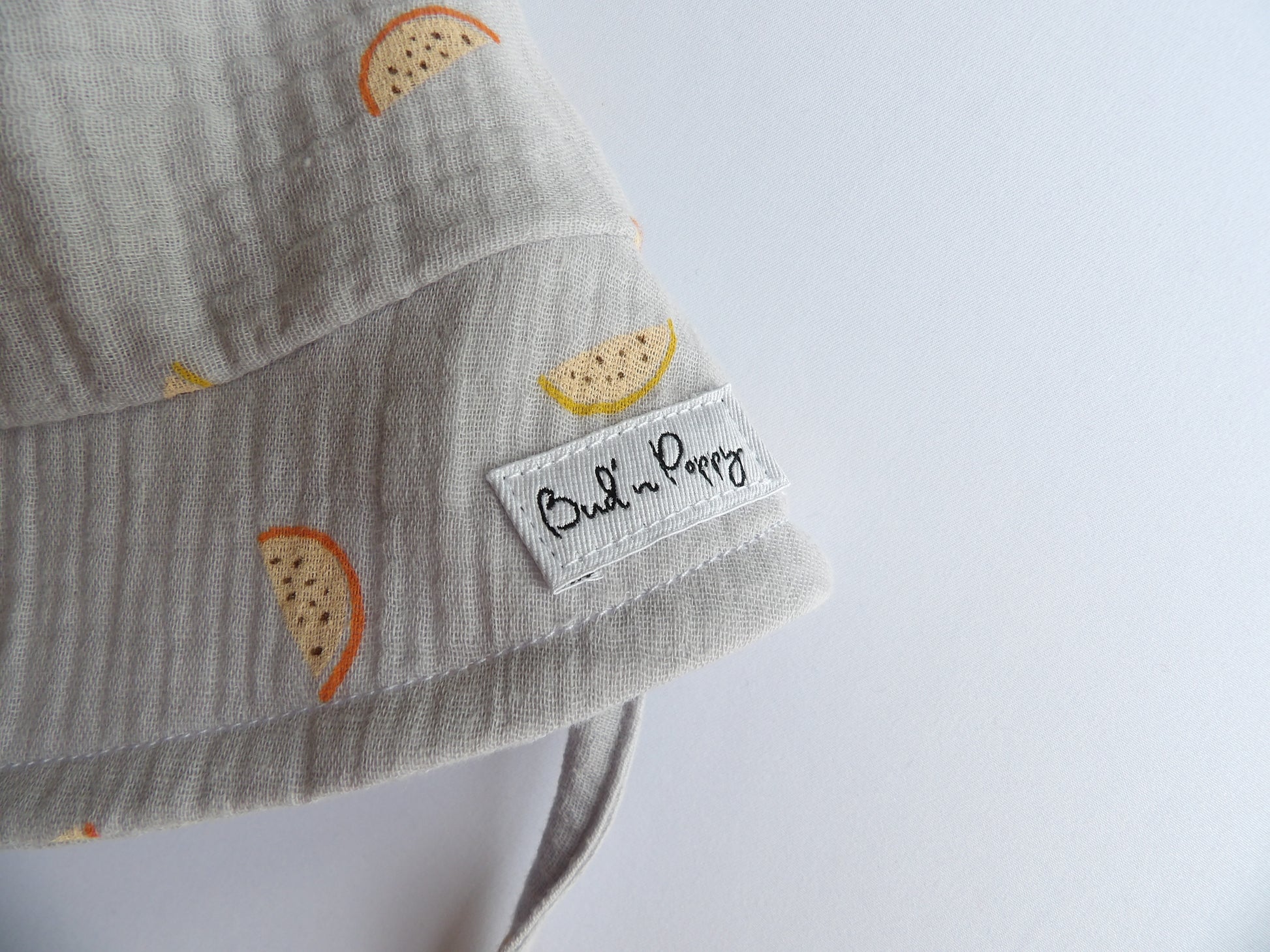- A baby sun hat made from the same soft muslin fabric as the pants (size 74, 6-9 months). The sun hat is perfect for sunny days and is easily tied to keep it in place.