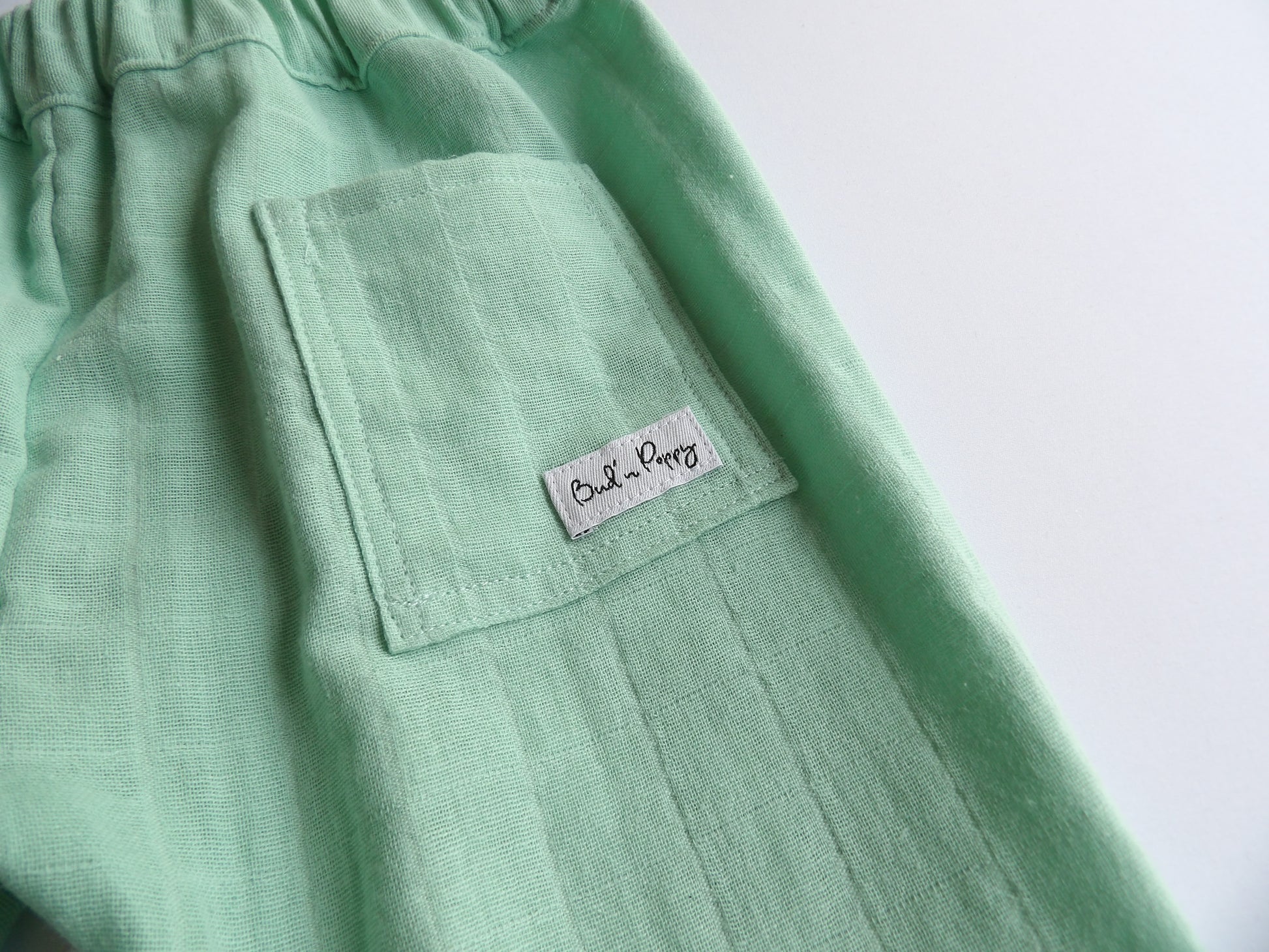 - A pair of soft muslin pants for baby. The pants are perfect for warm days and the elastic at the waist and leg ends provides a flexible and comfortable fit that keeps the pants in place.