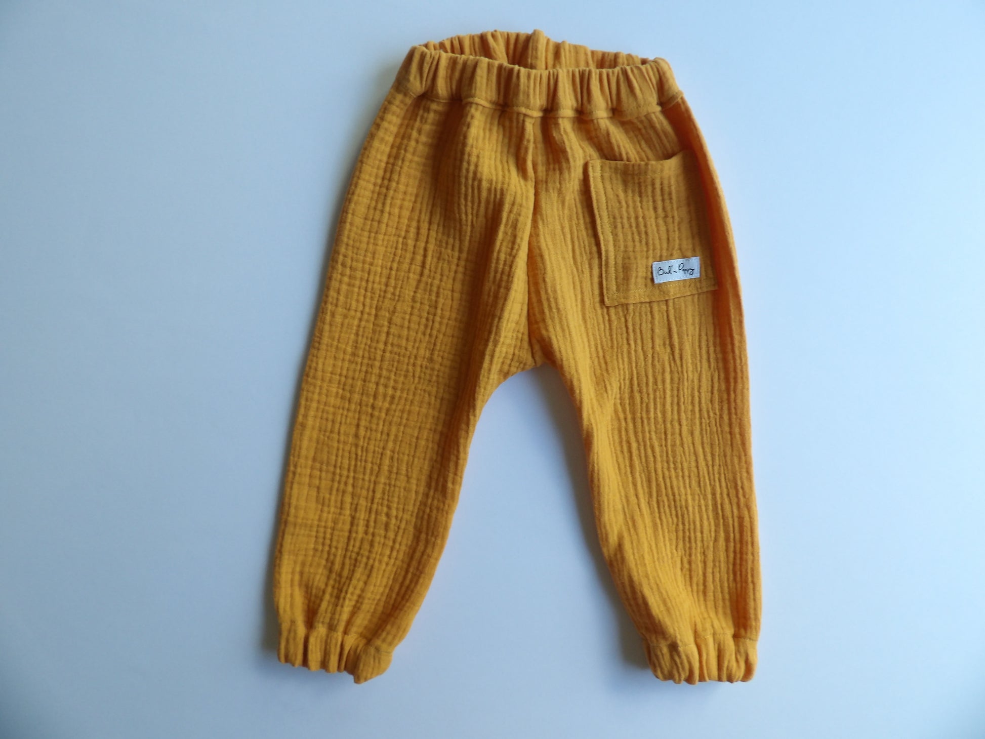 - A pair of soft muslin pants for baby. The pants are perfect for warm days and the elastic at the waist and leg ends provides a flexible and comfortable fit that keeps the pants in place.