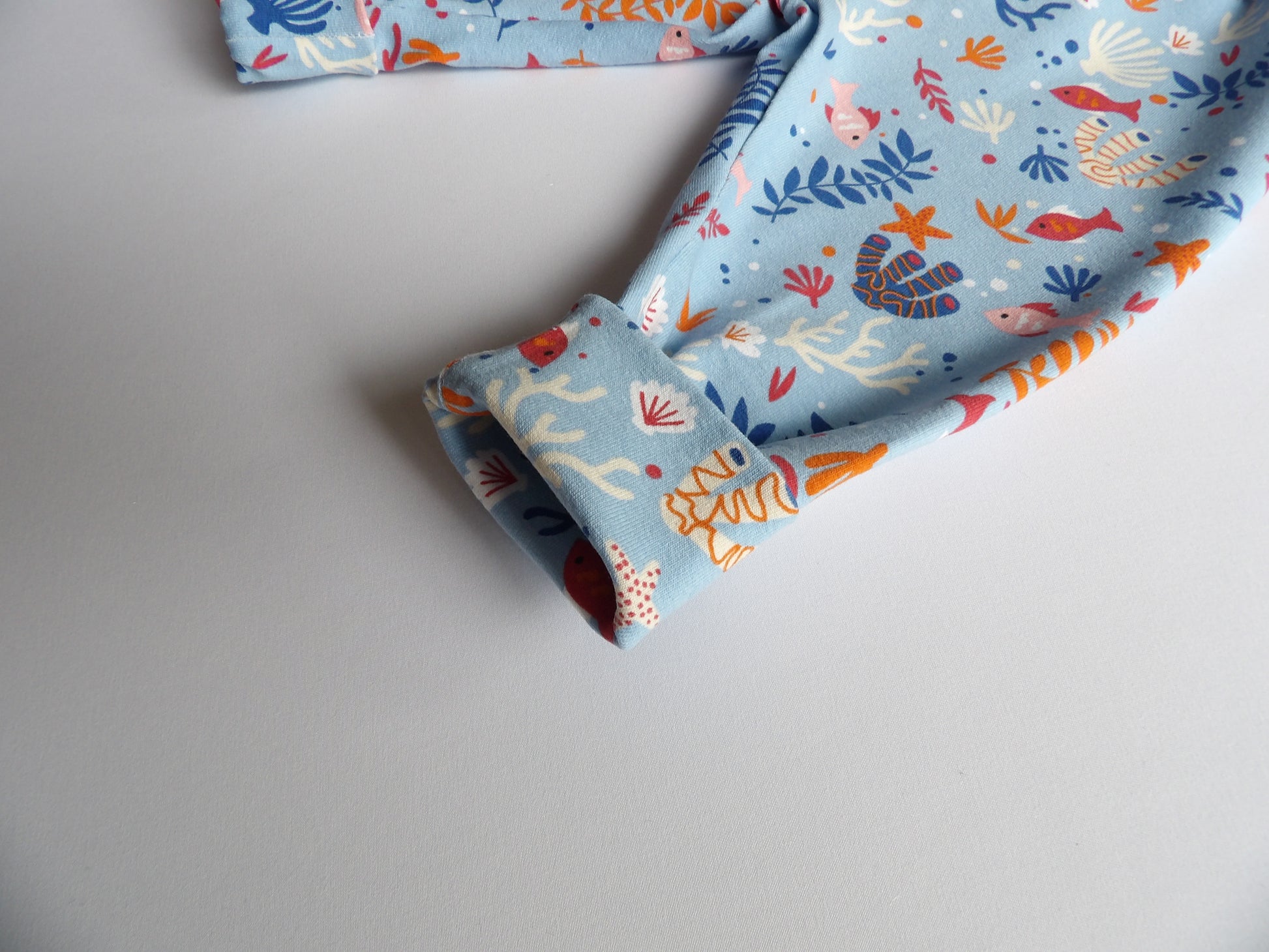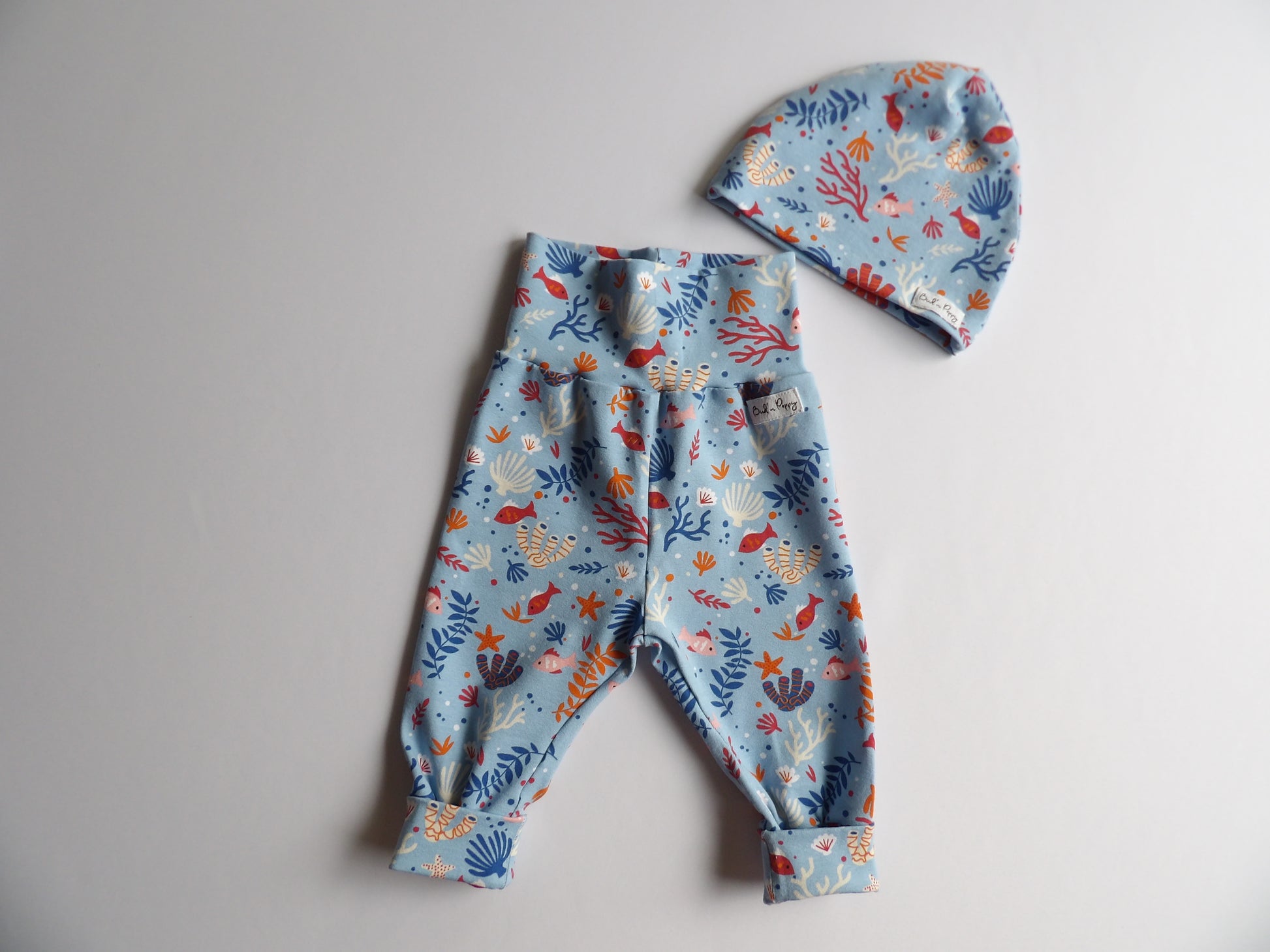 - A pair of airy and soft grow-out pants, in soft jersey fabric for baby. The pants have extra long cuffs at the waist and leg ends that can be easily folded down as the baby grows, extending the use time and providing a flexible fit.