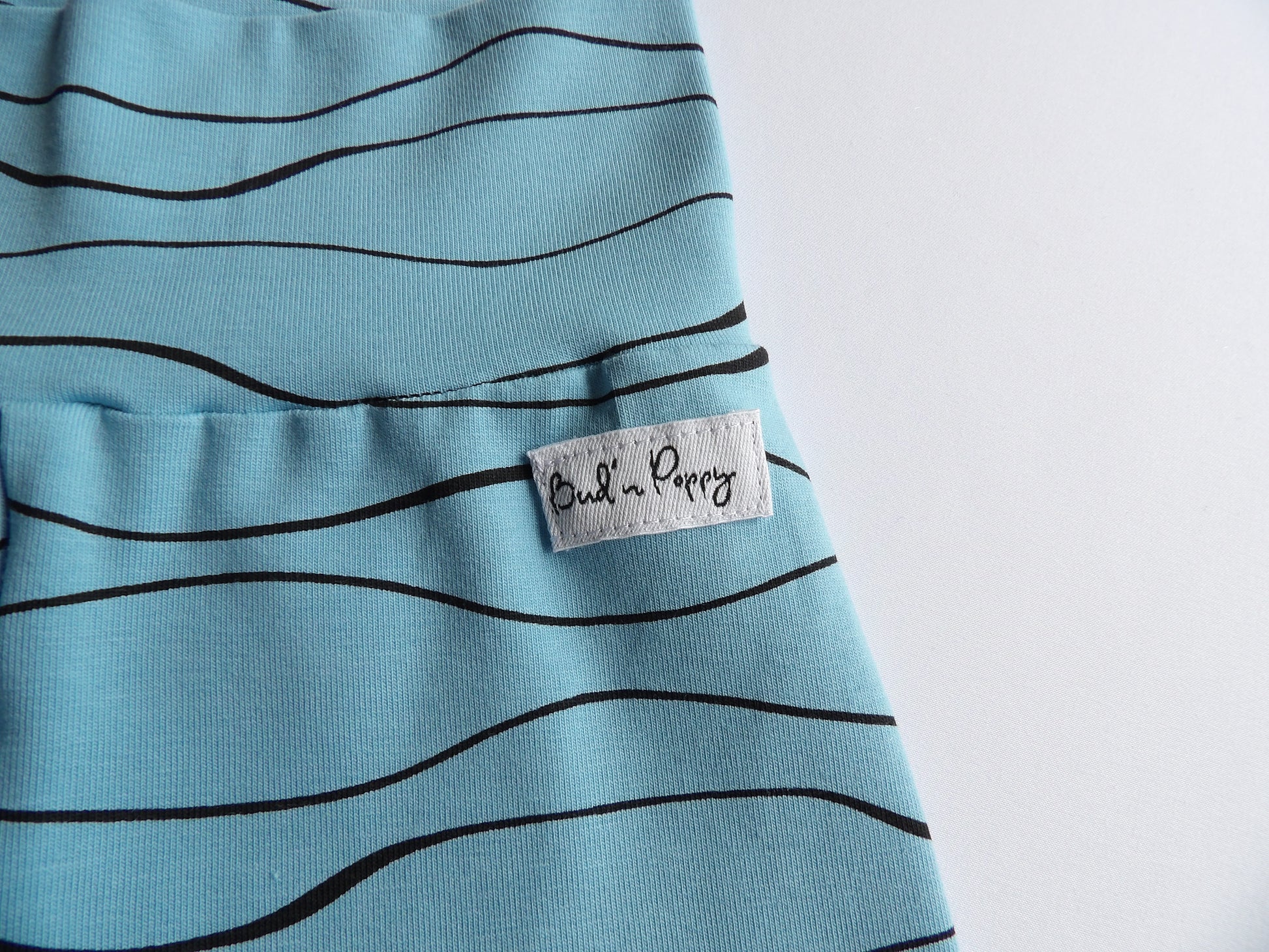 - A pair of airy and soft grow-out pants, in soft jersey fabric for baby. The pants have extra long cuffs at the waist and leg ends that can be easily folded down as the baby grows, extending the use time and providing a flexible fit.