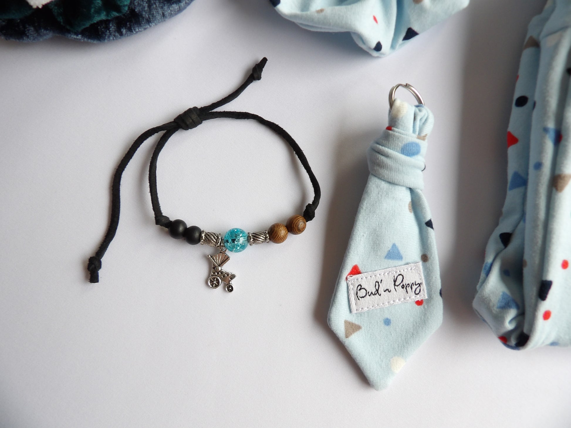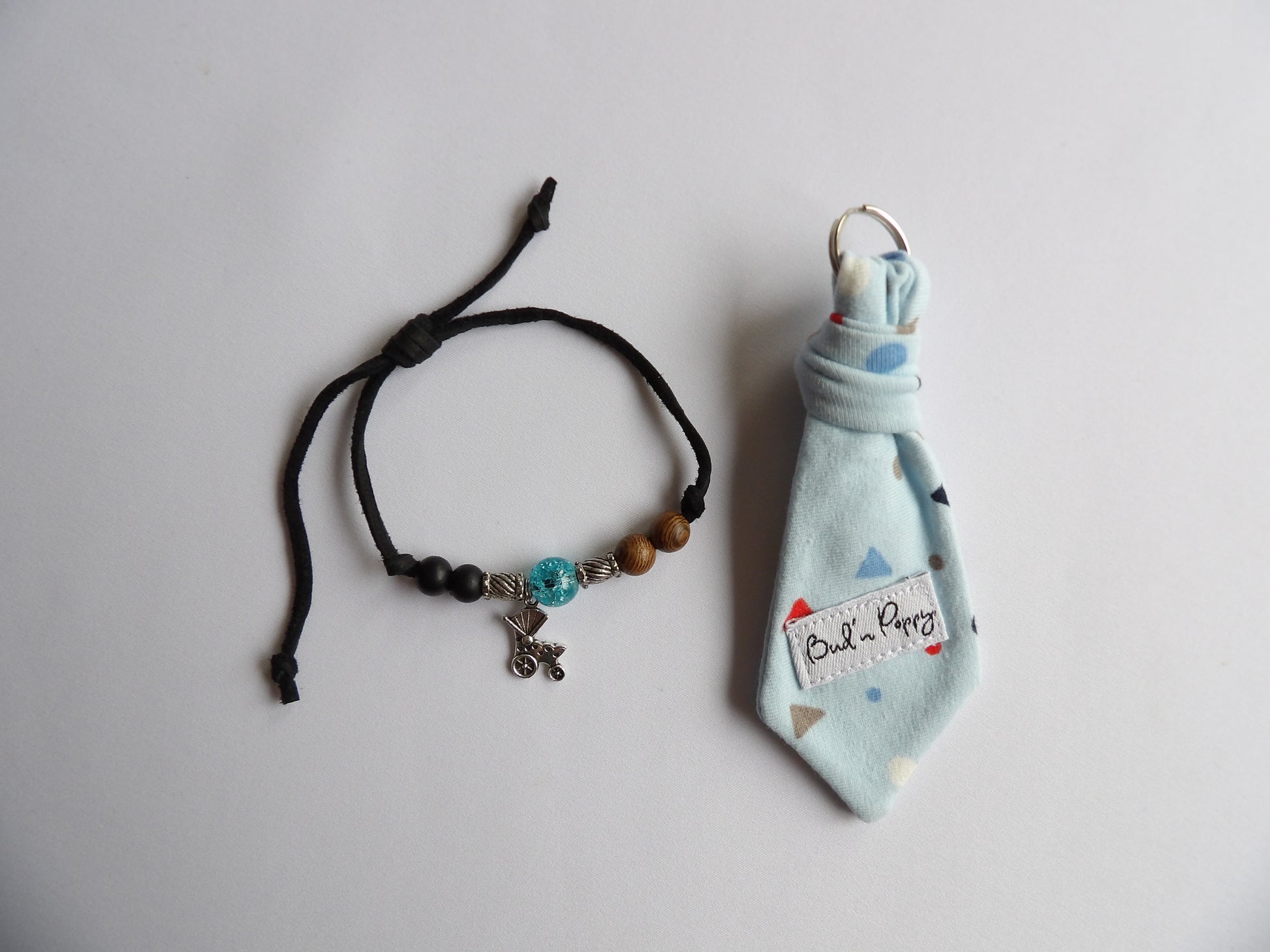 - Bud'n Poppy's signature detail, Bud'n Poppy's tie pendant/keyring for adults made in the same jersey fabric as the baby clothes.