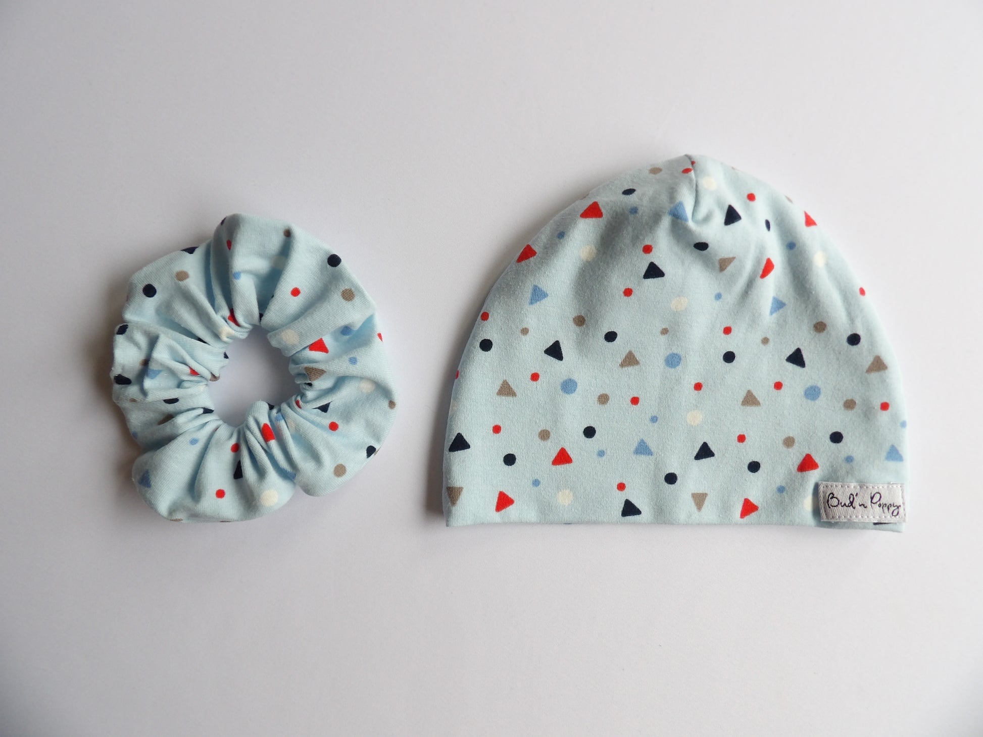 - A matching scrunchie for adults in the same soft jersey fabric as the baby clothes.