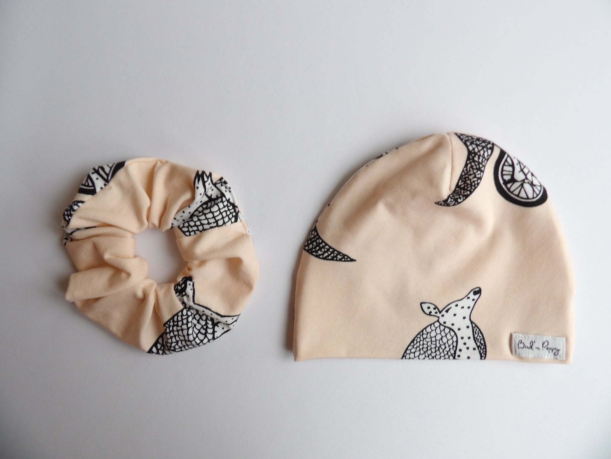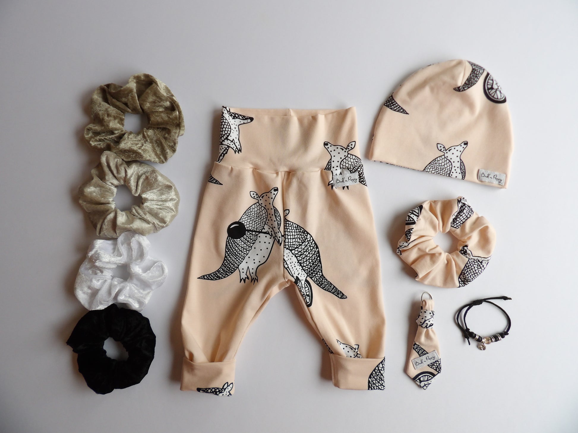- A matching scrunchie for adults in the same soft jersey fabric as the baby clothes.