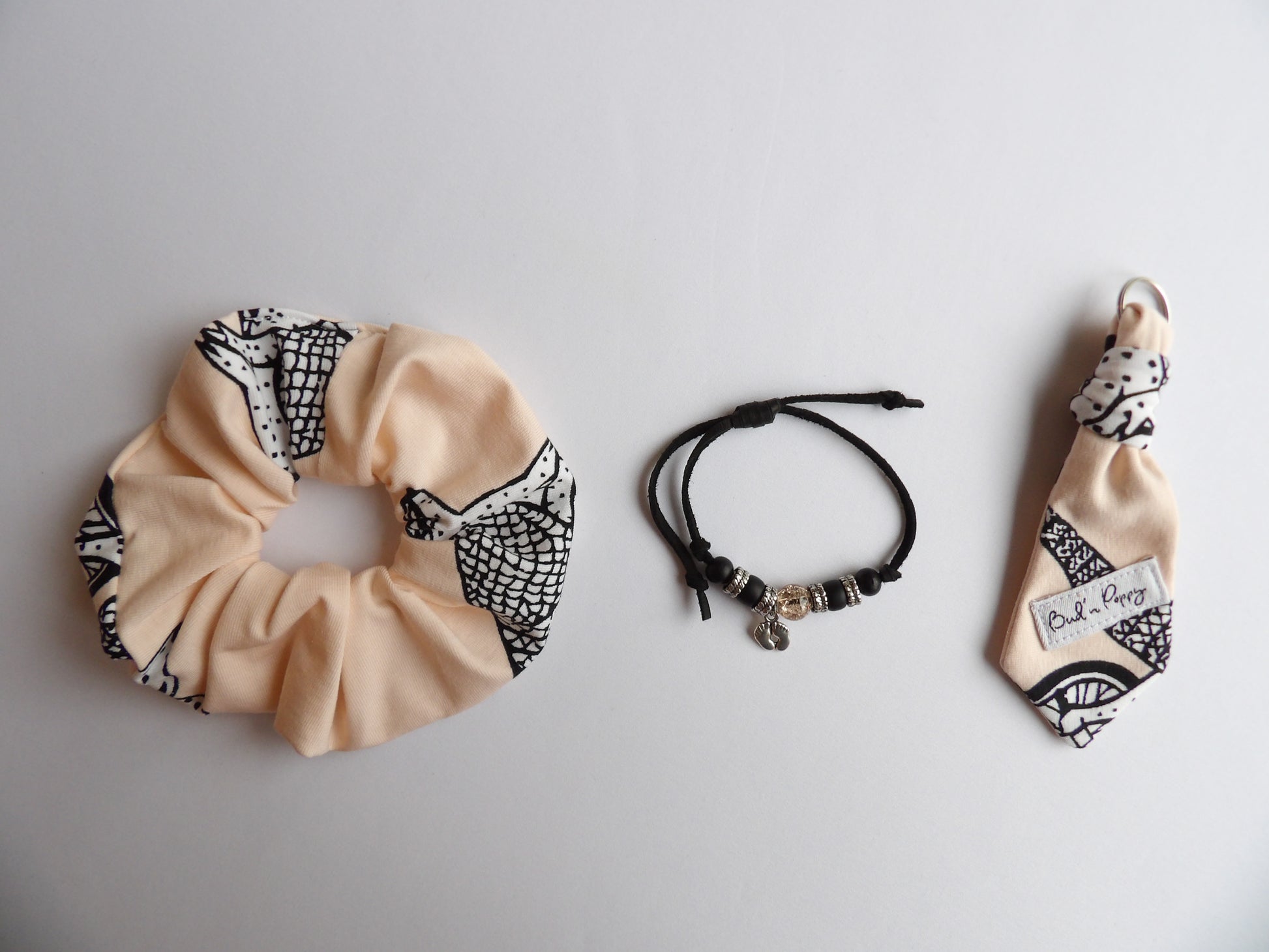 - Bud'n Poppy's signature detail, Bud'n Poppy's tie pendant/keyring for adults made in the same jersey fabric as the baby clothes.