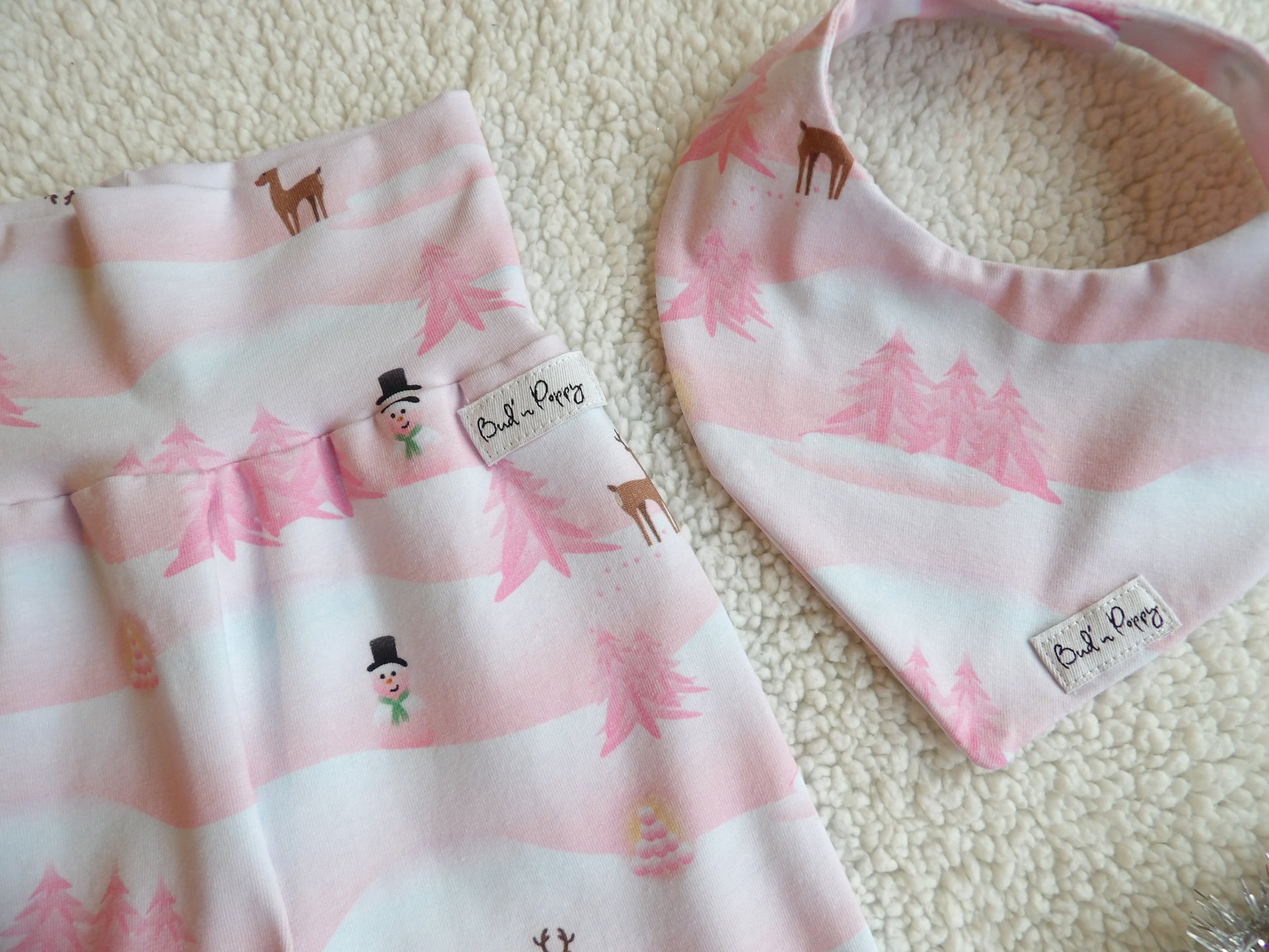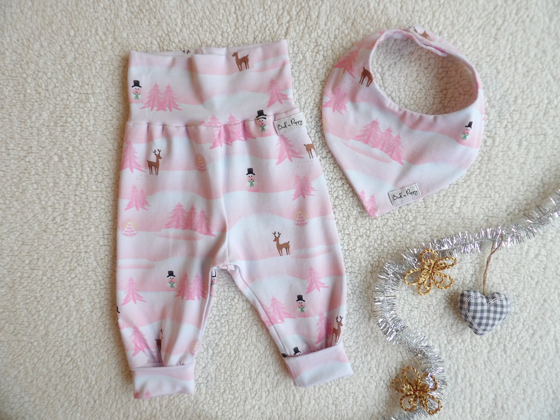 Bud’n Poppys duo-set för baby består av ett par växa-byxor i mjukt trikåtyg och en dregglis sydd i samma mjuka tyg.