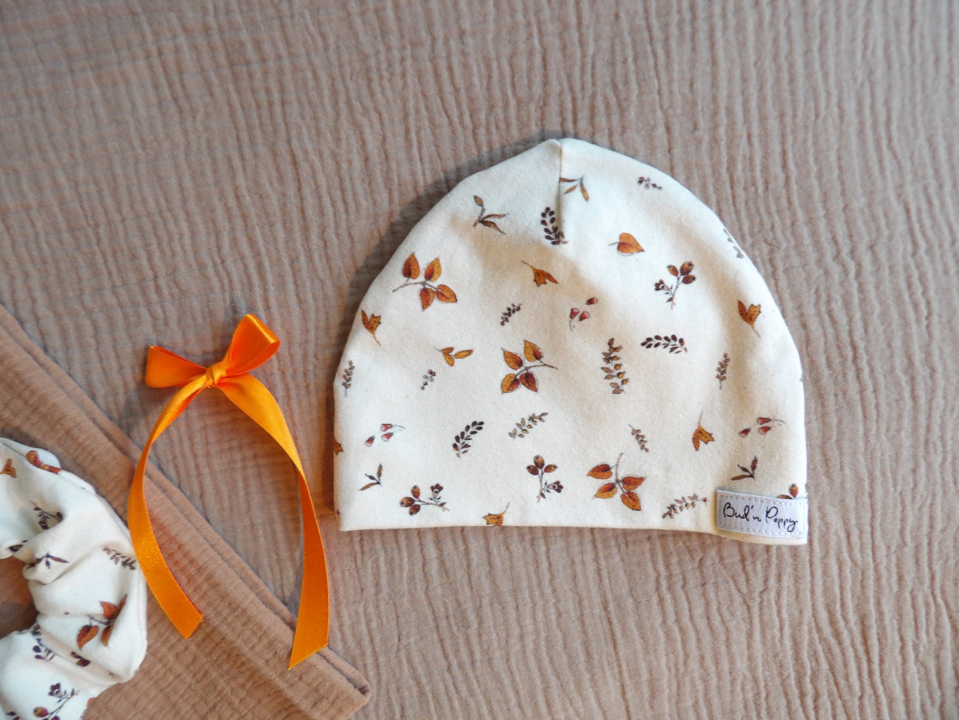 💛 Till varje BB-mössa följer en matchande accessoar till föräldern i samma tyg – en scrunchie eller ett Bud’n Poppy-hängsmycke/nyckelring. En symbol för bandet mellan liten och stor, att bära vidare även när babyn vuxit ur sin första mössa.
