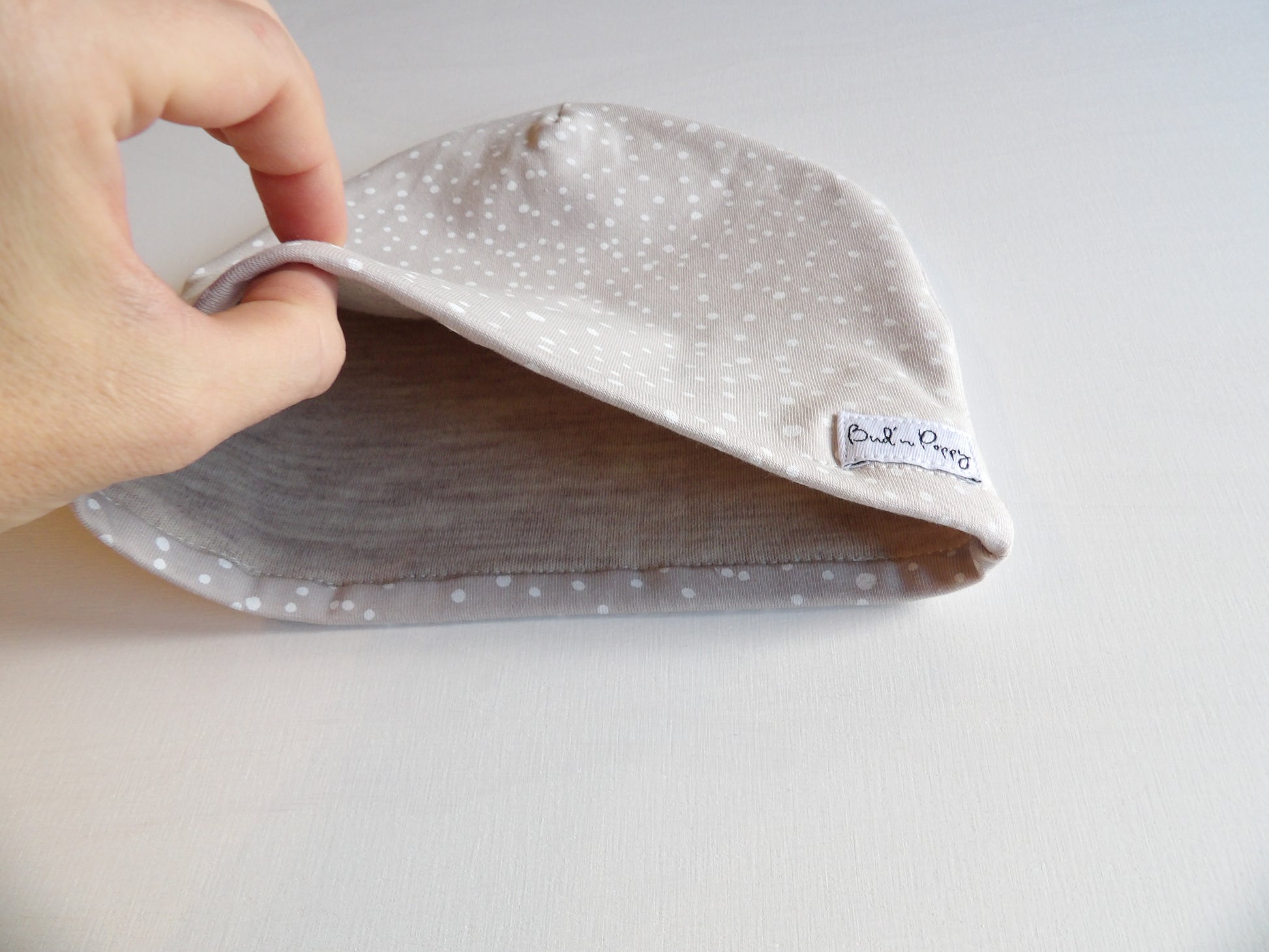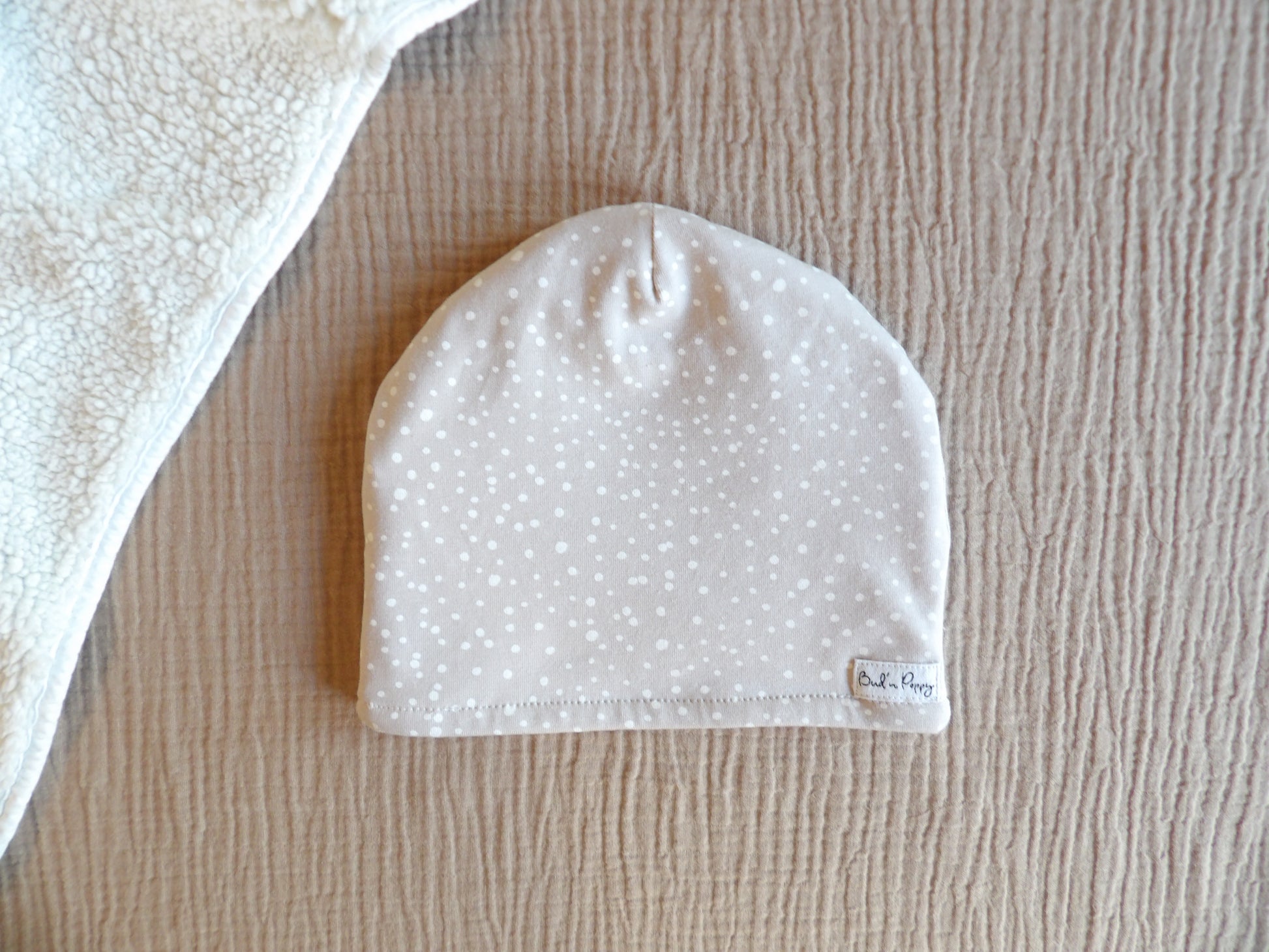 - Färg och mönster: Ljusbeige mössa med vita prickar på.