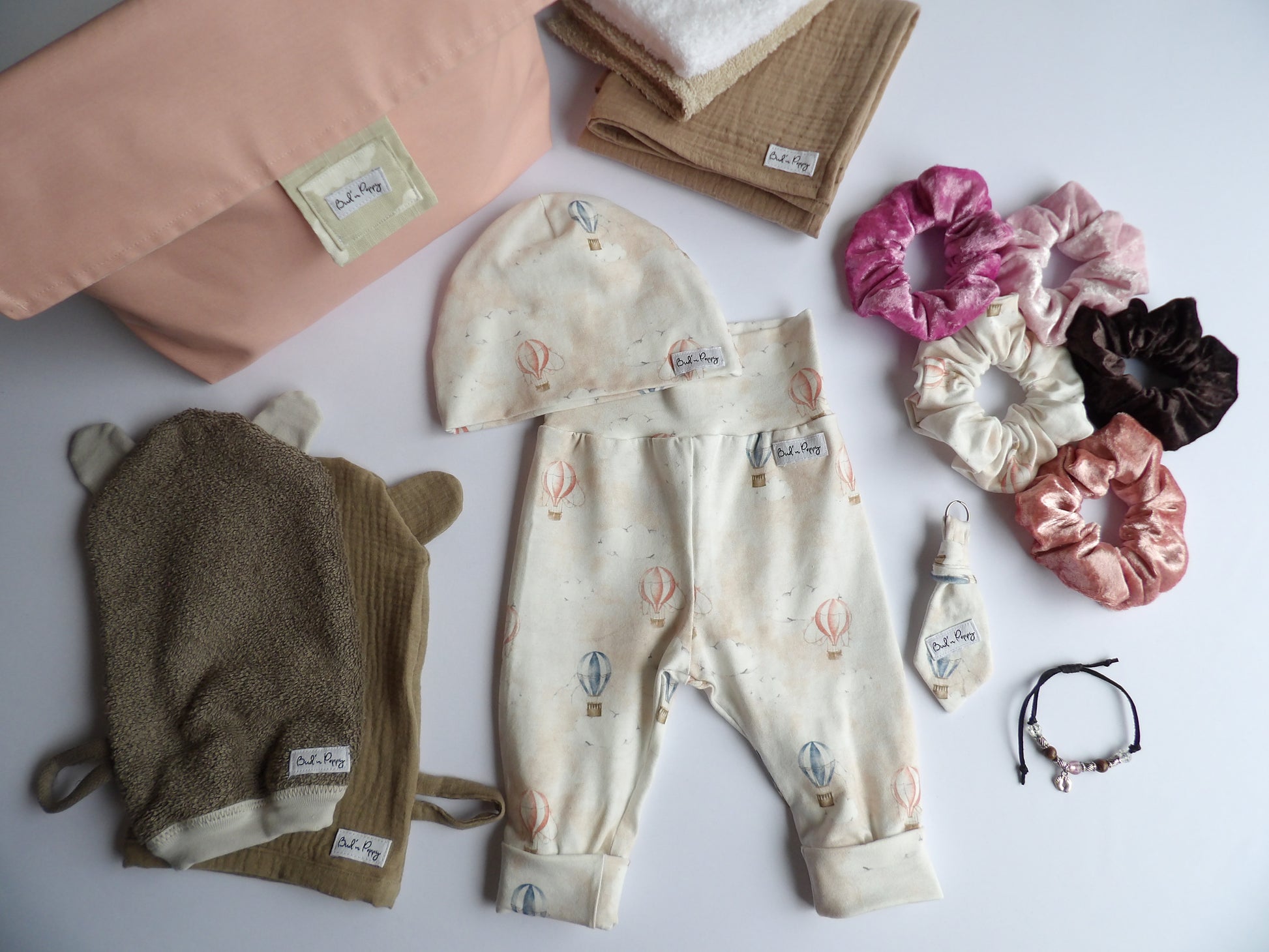 - 🎀 En matchande scrunchie till vuxen i samma mjuka trikåtyg som babykläderna.