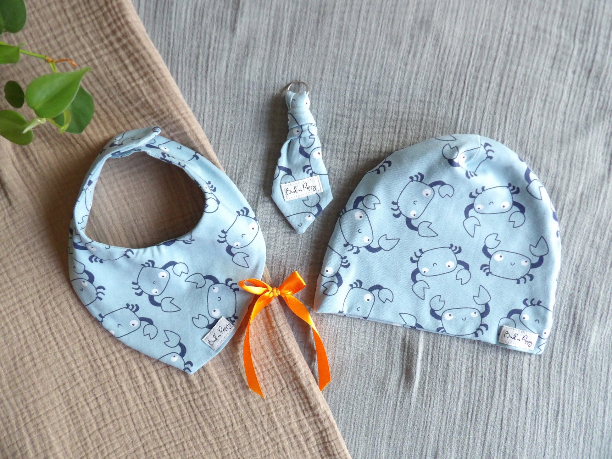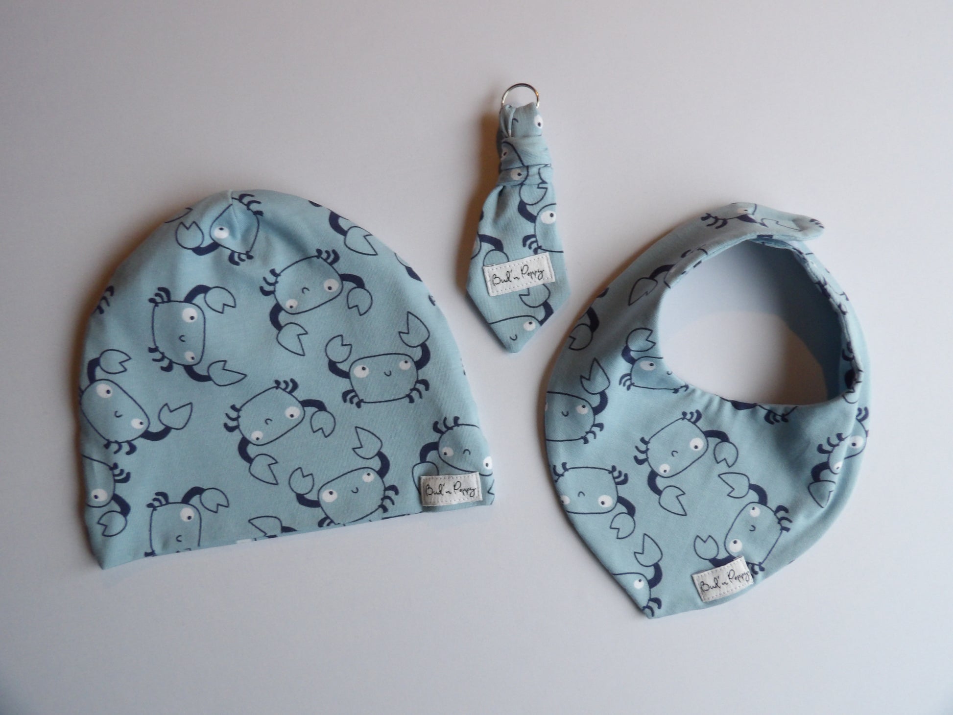 Ett handgjort set i OEKO-TEX®-certifierade tyger. Mini Trio innehåller en babymössa, en dregglis till baby och en matchande accessoar till föräldern. Perfekt som present till babyshowern eller till dig själv och din baby. Tillverkade med omsorg i små upplagor.
