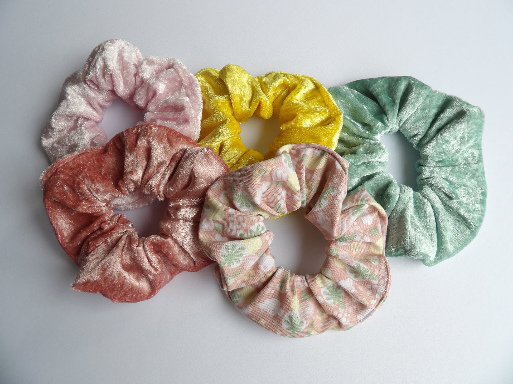 - Fyra scrunchies till vuxen i velourtyg i olika färger, där färgerna är noggrant utvalda för att matcha det kompletta setet.