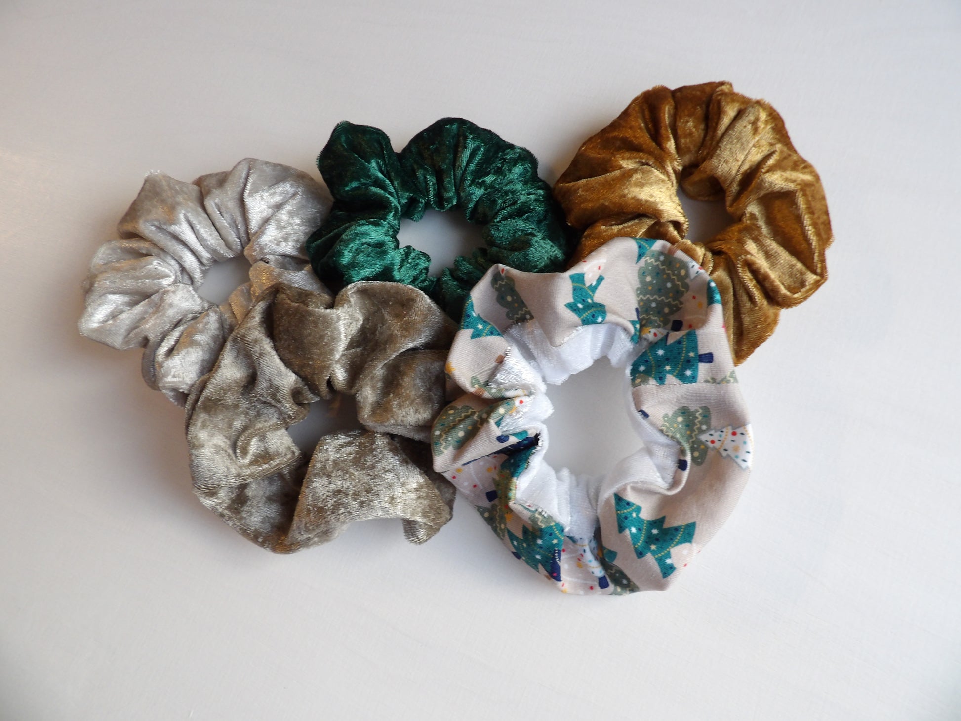 - Fyra scrunchies till vuxen i velourtyg i olika färger, där färgerna är noggrant utvalda för att matcha det kompletta setet.