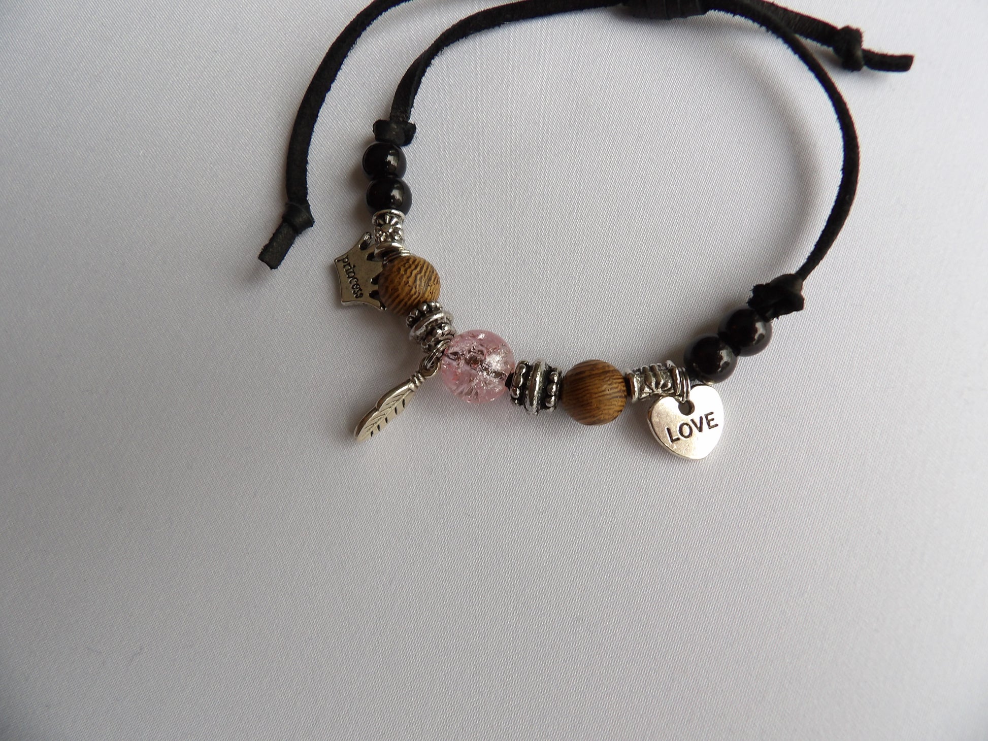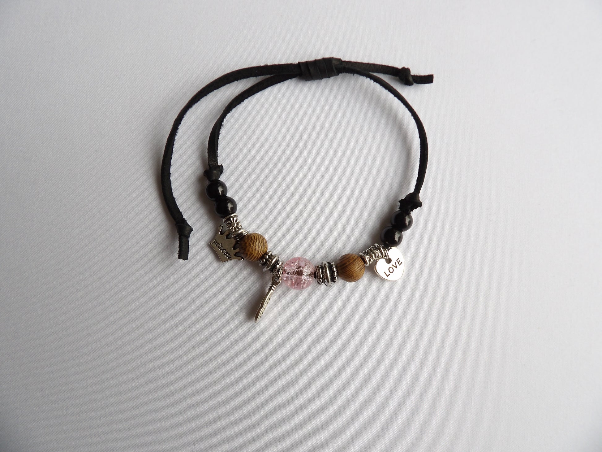 Armbandet för vuxen: Material band: Äkta hjortskinn (laskrem). Material pärlor, mellandelar och berlock: Metall, glas, trä och rostfritt stål. Skötselråd: Torkas av med fuktig trasa.