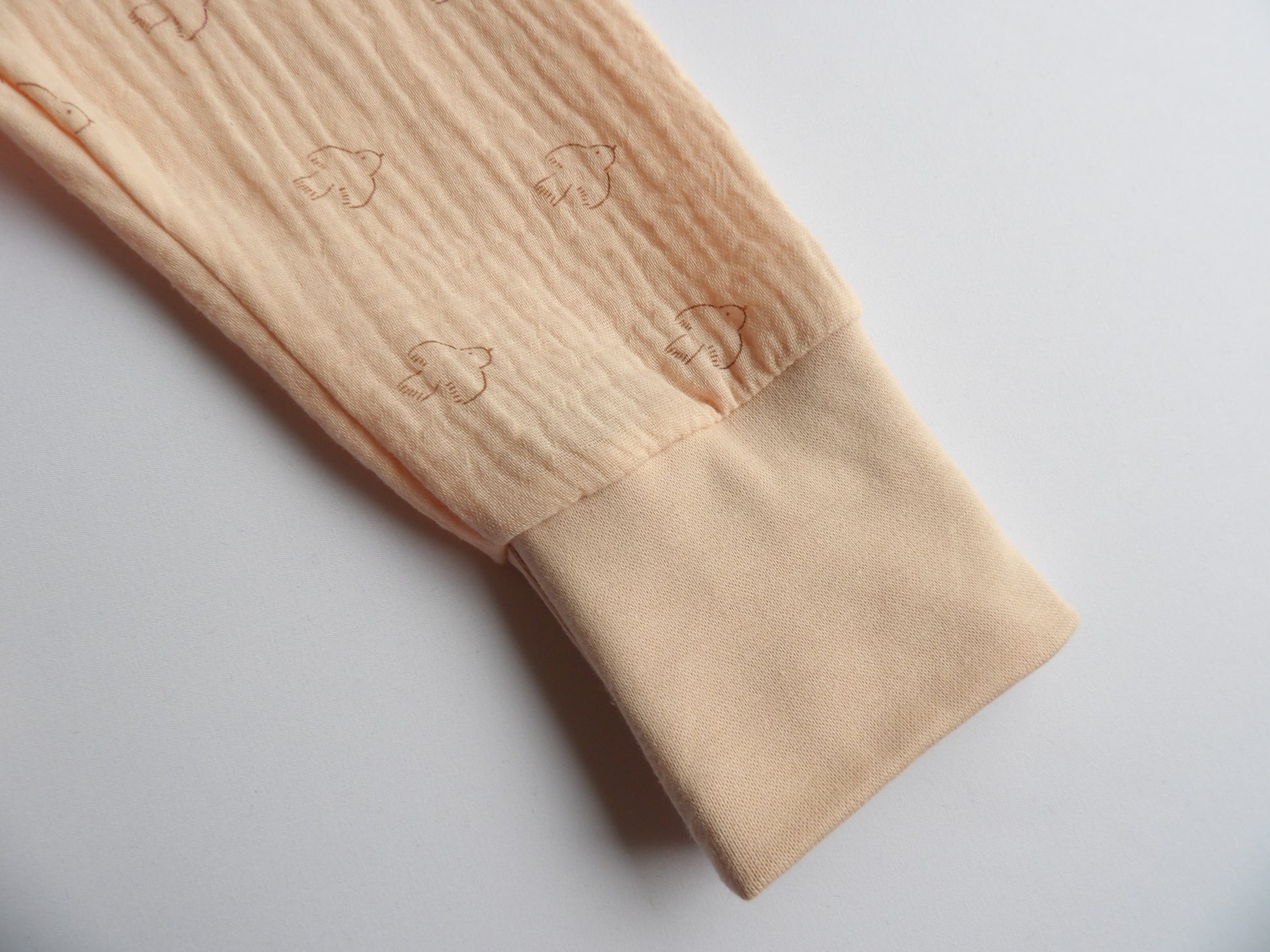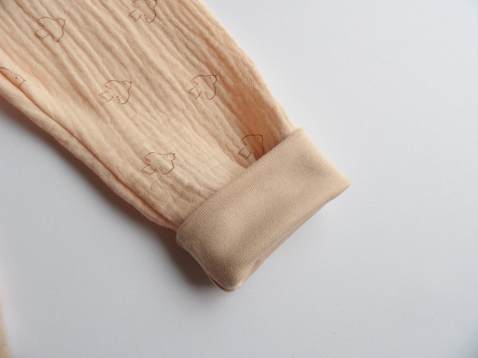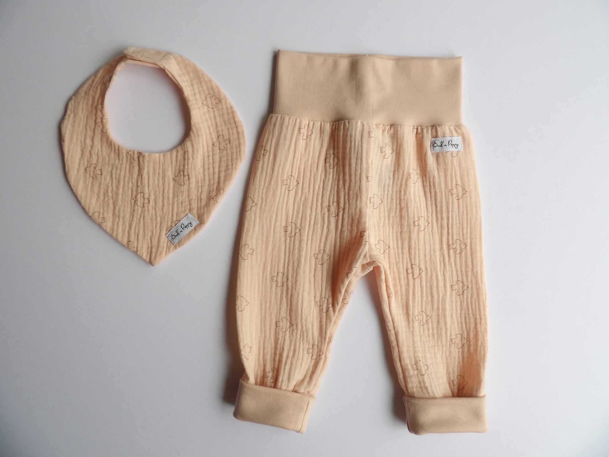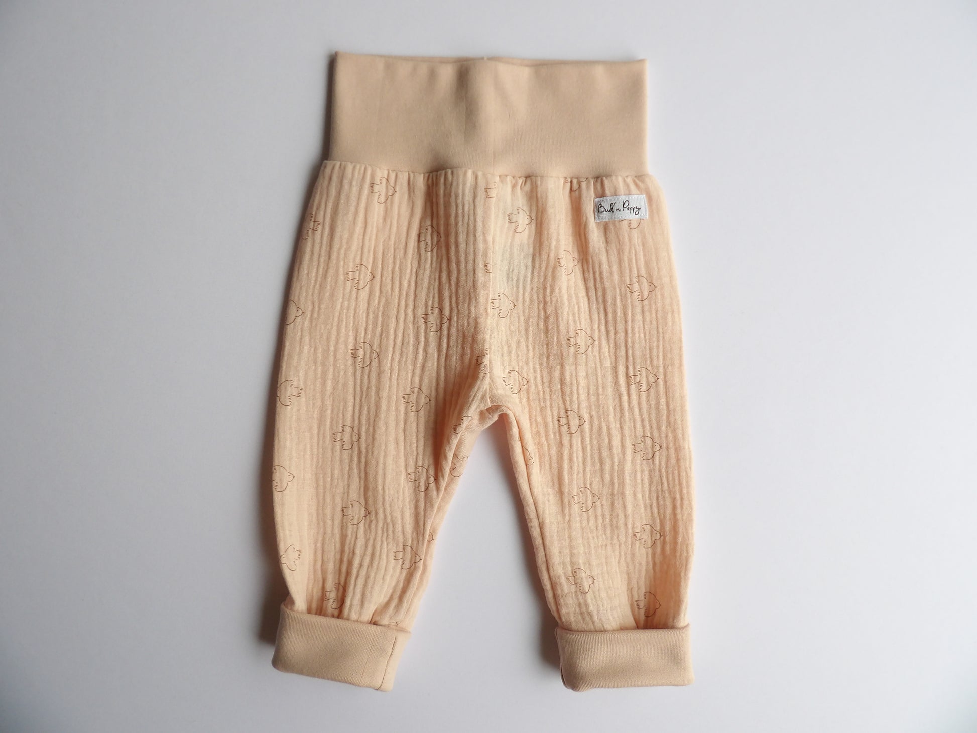 - 👖Ett par luftiga och mjuka växa-byxor till baby. Byxan är tillverkad i mjukt muslintyg och med muddar av trikå. Byxan har extra långa muddar i midja och benslut som enkelt kan vikas ner i takt med att babyn växer, vilket förlänger användningstiden och ger en flexibel passform.