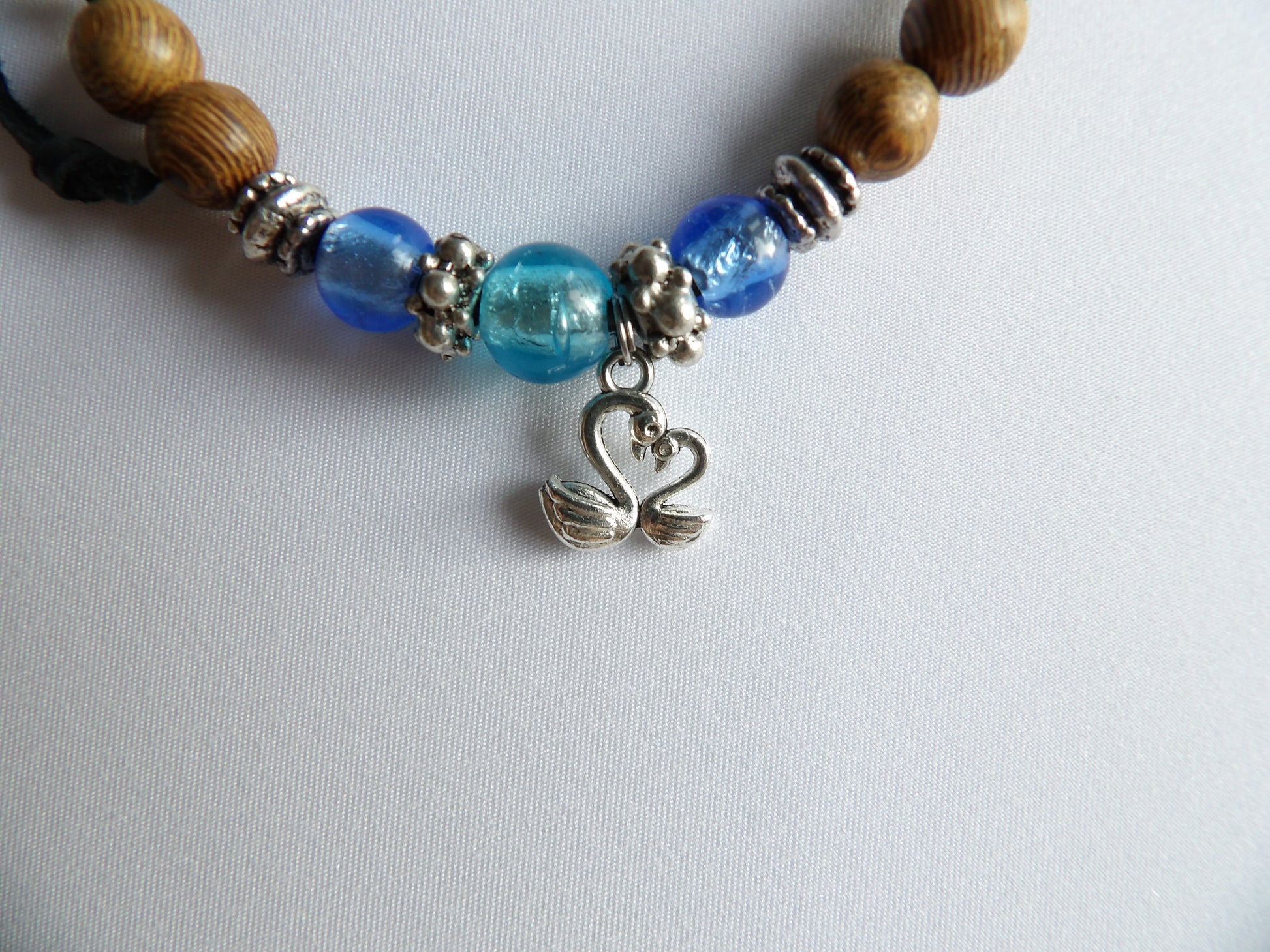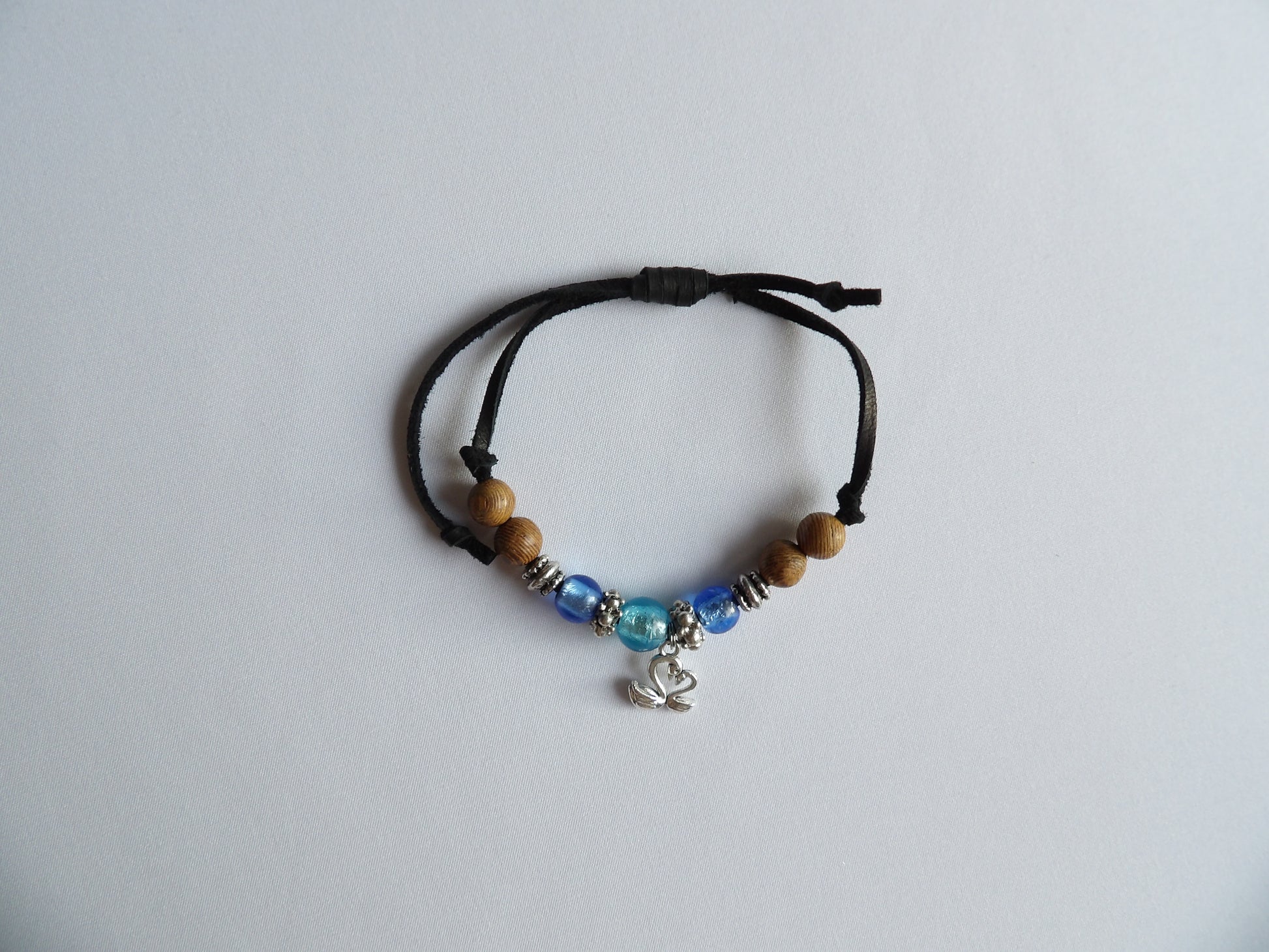 Material band: Äkta hjortskinn (laskrem). Material pärlor, mellandelar och berlock: Metall, trä, glas och rostfritt stål. Skötselråd: Torkas av med fuktig trasa.