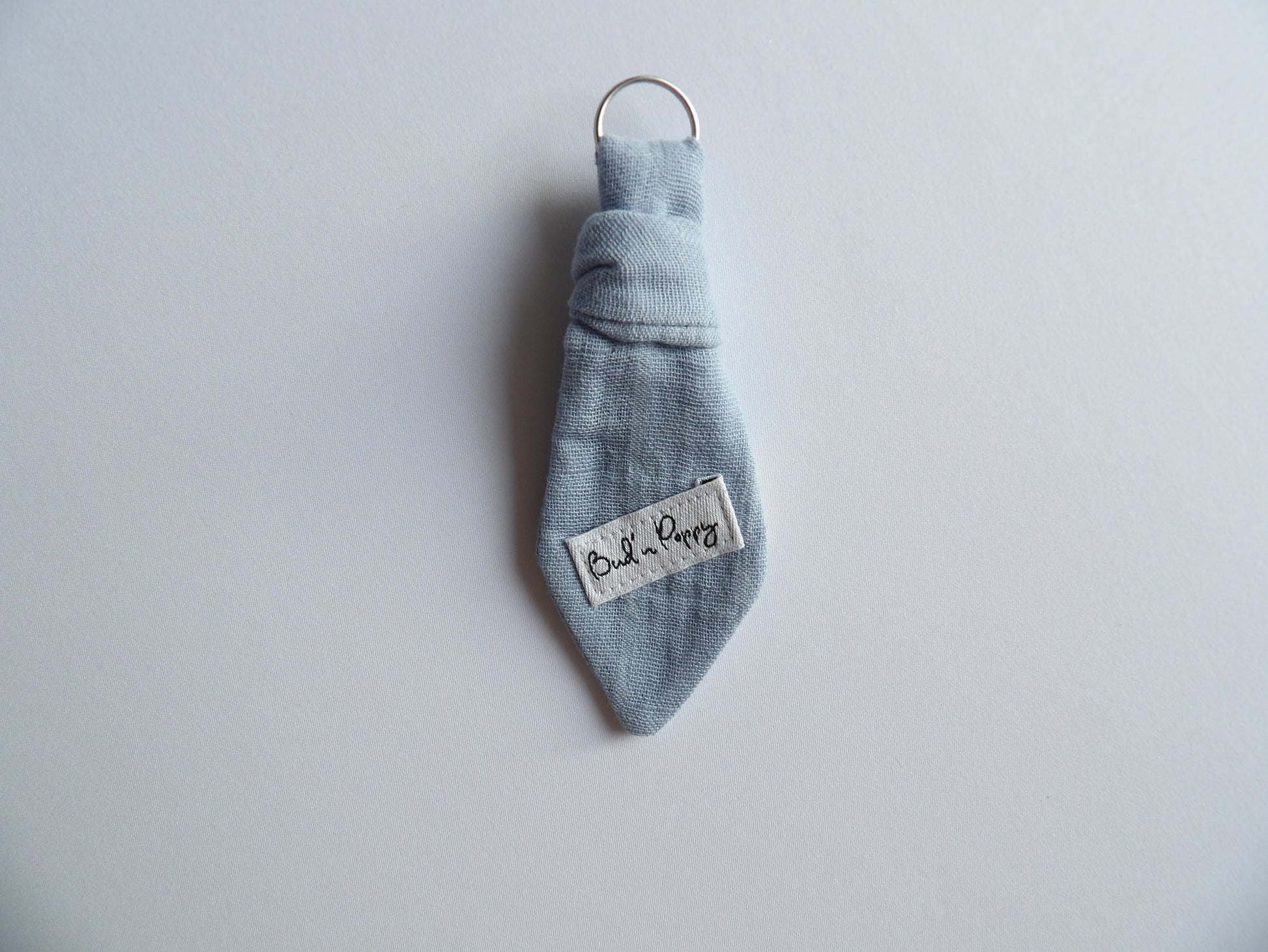 - Bud´n Poppys signaturdetalj, Bud´n Poppys slips-hängsmycke/nyckelring till vuxen. Bud´n Poppys slips-hängsmycke/nyckelring är tillverkad i samma muslintyg som babykläderna.