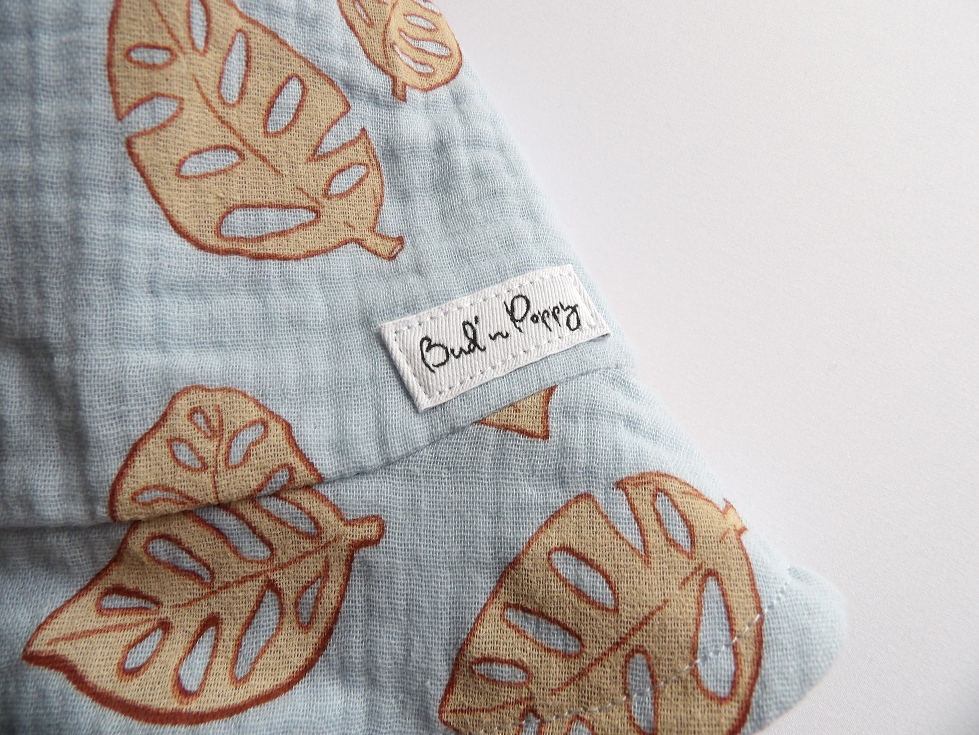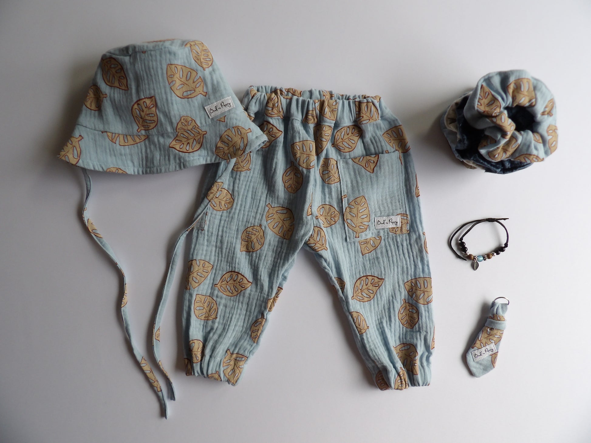 - En solhatt till baby tillverkad i samma mjuka muslintyg som byxorna (storlek 74, 6-9 månader). Solhatten är perfekt för soliga dagar och knyts enkelt för att hållas på plats.