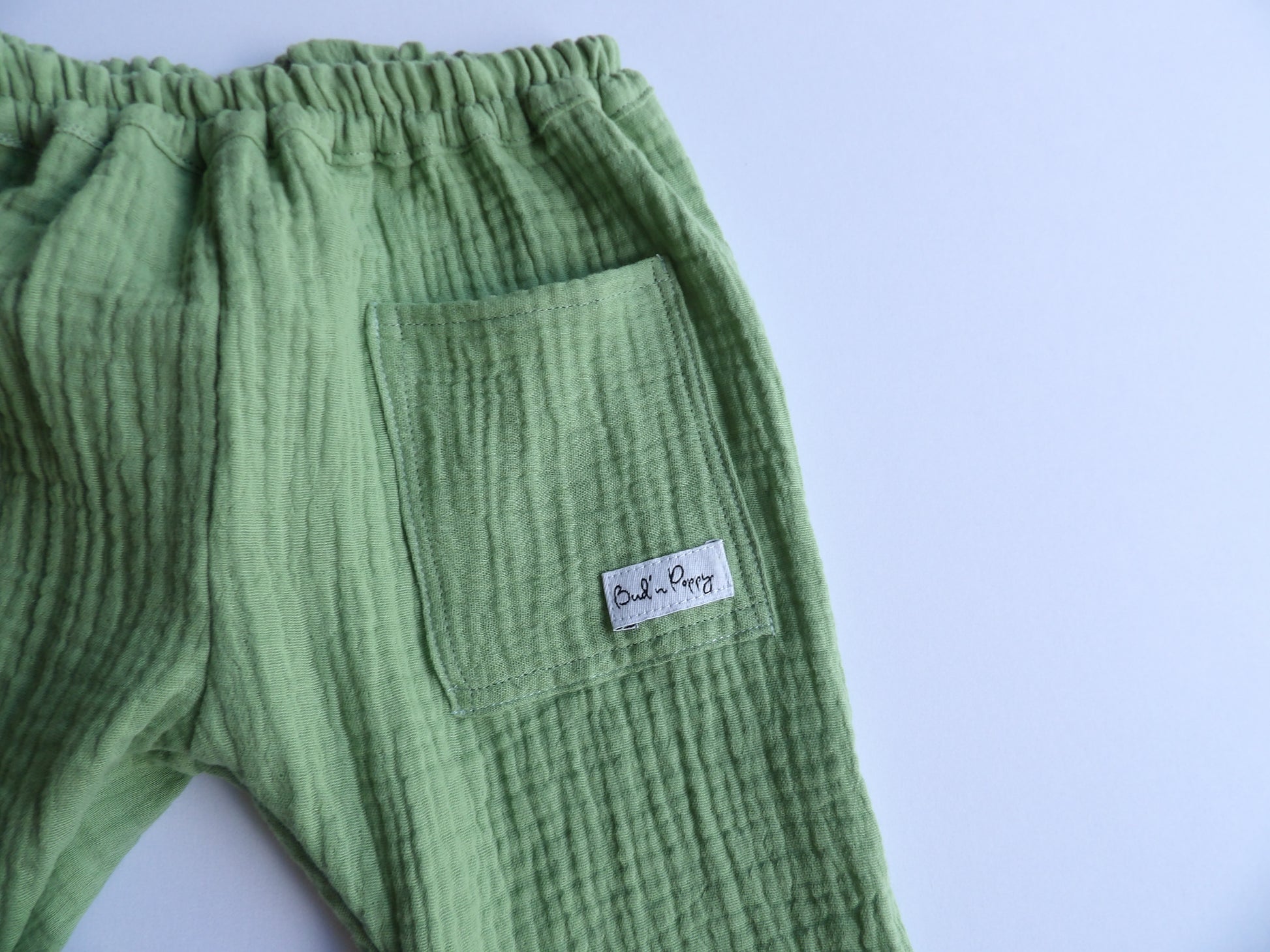 - Ett par mjuka byxor i muslintyg till baby. Byxan är perfekt för varma dagar och resår i midja och benslut ger en följsam och bekväm passform som håller byxorna på plats.