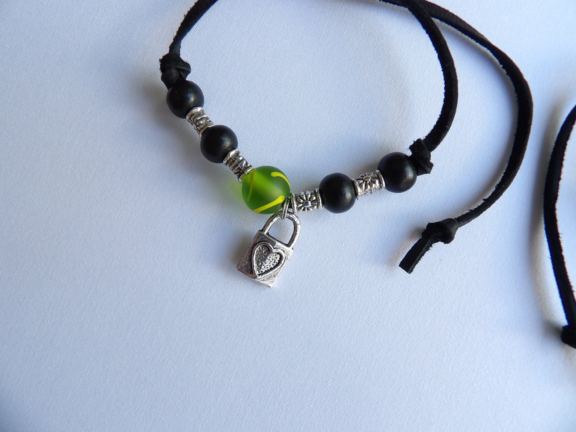 - 2 handgjorda armband till vuxen som matchar med setet. Bandet på armband 1, med hänglås-berlock, är tillverkat i naturligt, slitstarkt hjortskinn (laskrem). Bandet på armband 2, med hjärta-berlock, är tillverkat i naturligt, mjukt och slitstarkt äkta mocka. Armbanden är justerbara för att passa de allra flesta handleder.