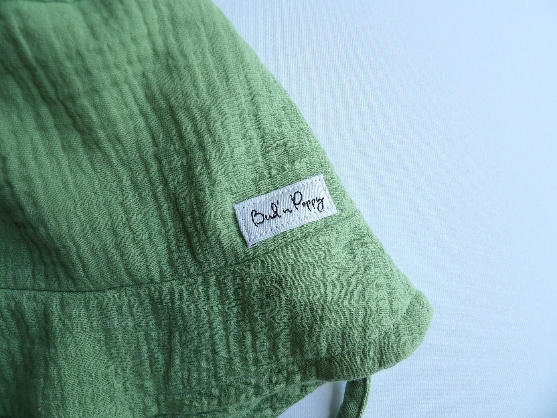 - En solhatt till baby tillverkad i samma mjukt muslintyg (storlek 74, 6-9 månader). Solhatten är perfekt för soliga dagar och knyts enkelt för att hållas på plats.