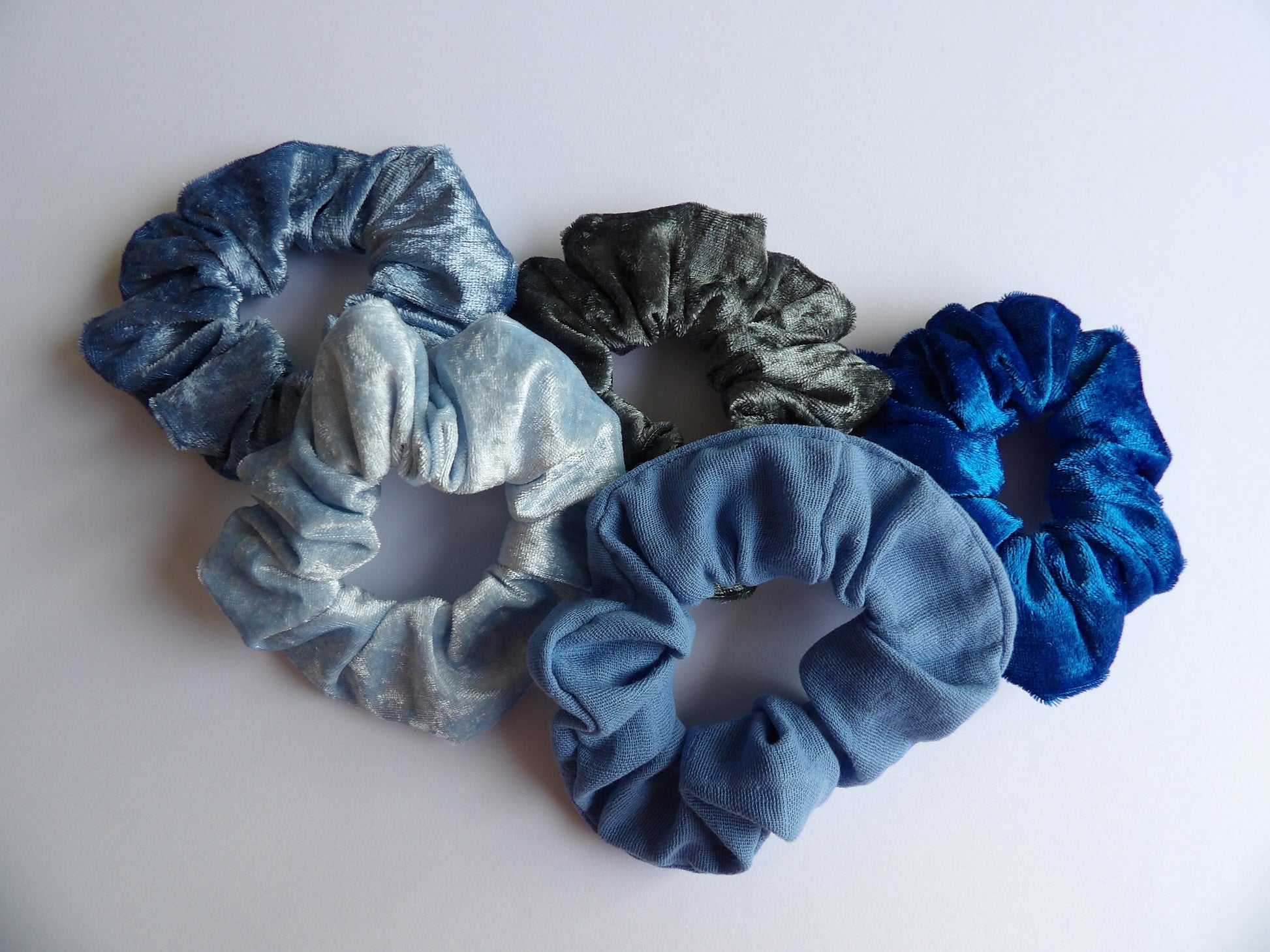 - Fyra scrunchies till vuxen i velourtyg i olika färger, där färgerna är noggrant utvalda för att matcha det kompletta setet.