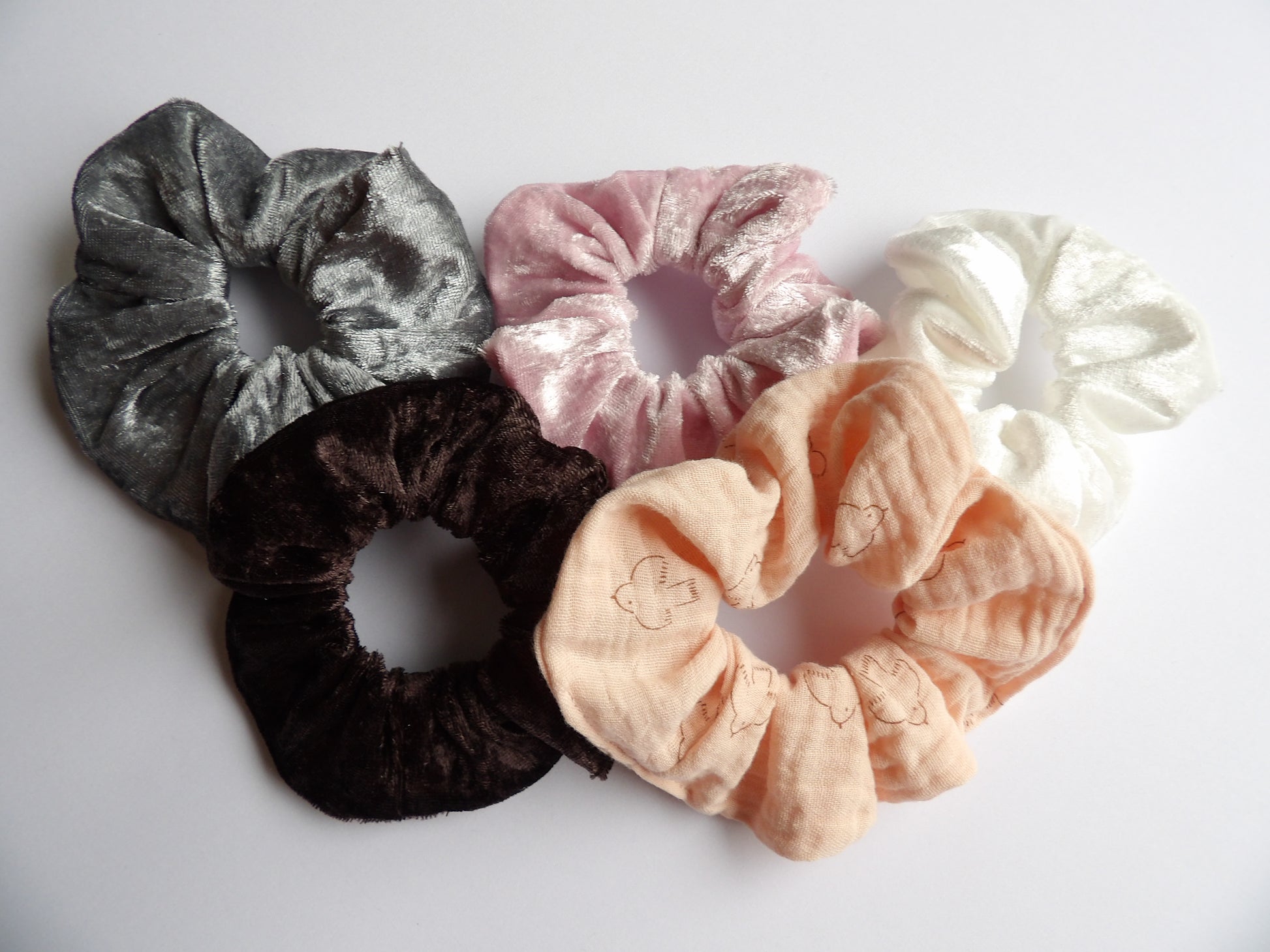 - Fyra scrunchies till vuxen i velourtyg i olika färger, där färgerna är noggrant utvalda för att matcha det kompletta setet.
