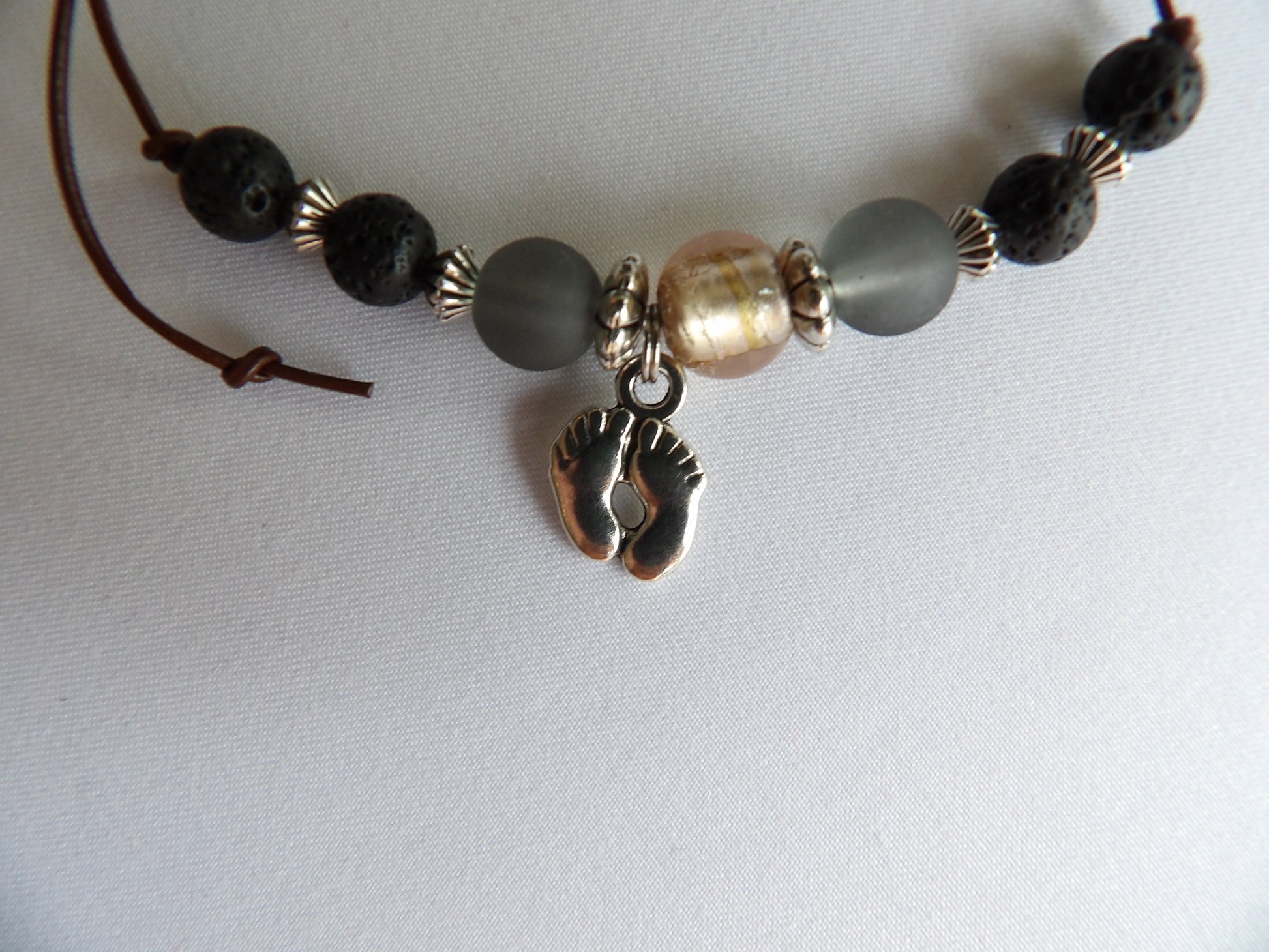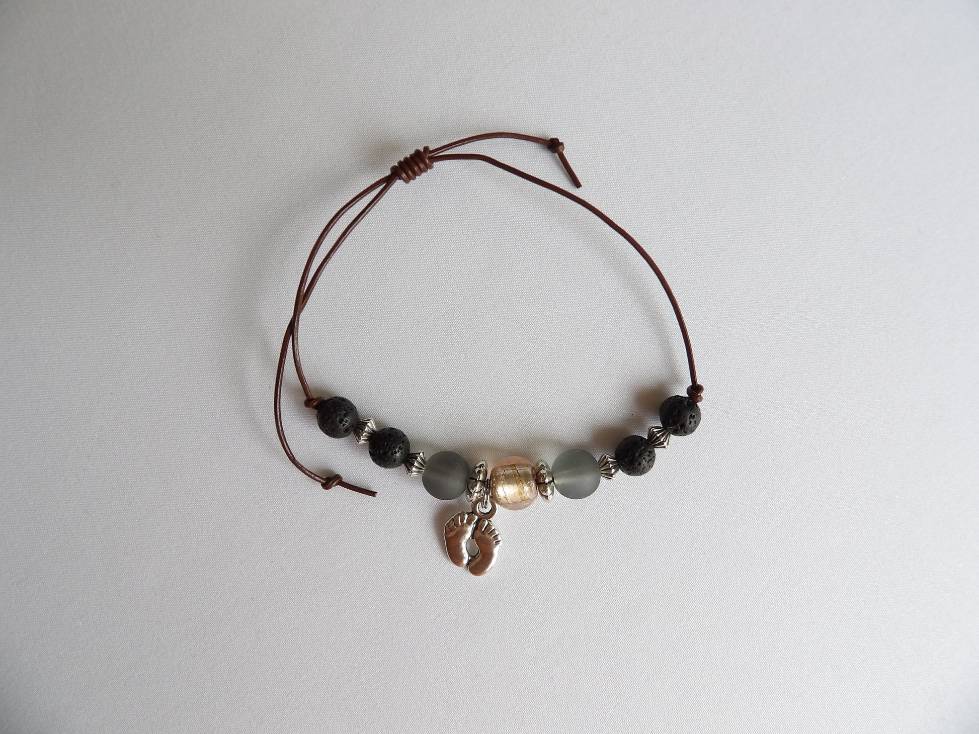 Material band: Äkta läder från nöt. Material pärlor, mellandelar och berlock: Glas, naturlig lava, metall och rostfritt stål. Skötselråd: Torkas av med fuktig trasa.