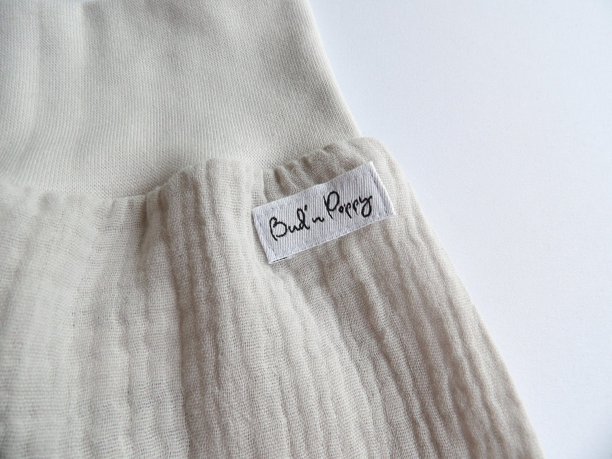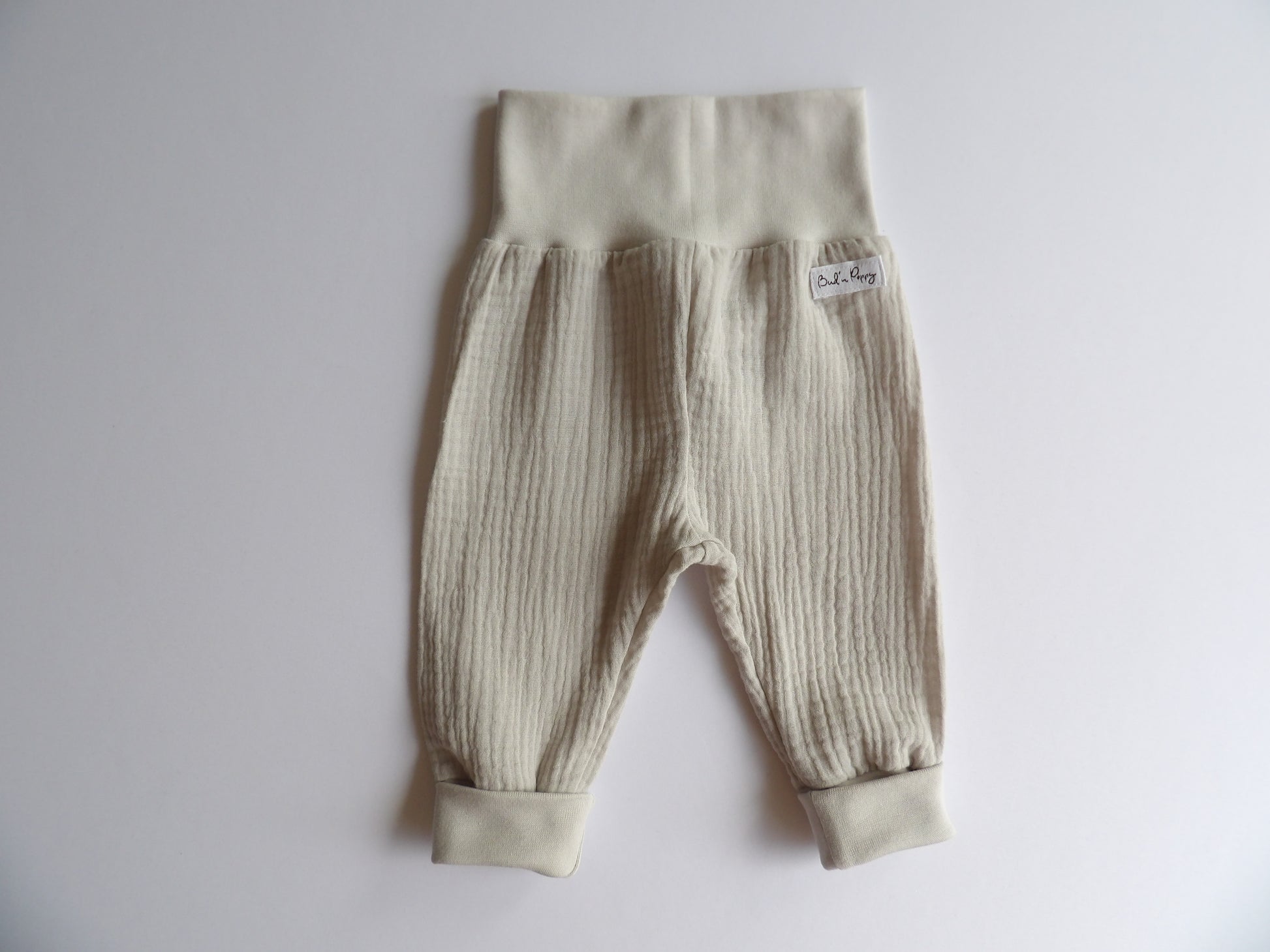 - Ett par luftiga och mjuka växa-byxor till baby. Växa-byxan är tillverkad i mjukt muslintyg och med muddar av trikå. Byxan har extra långa muddar i midja och benslut som enkelt kan vikas ner i takt med att babyn växer, vilket förlänger användningstiden och ger en flexibel passform.
