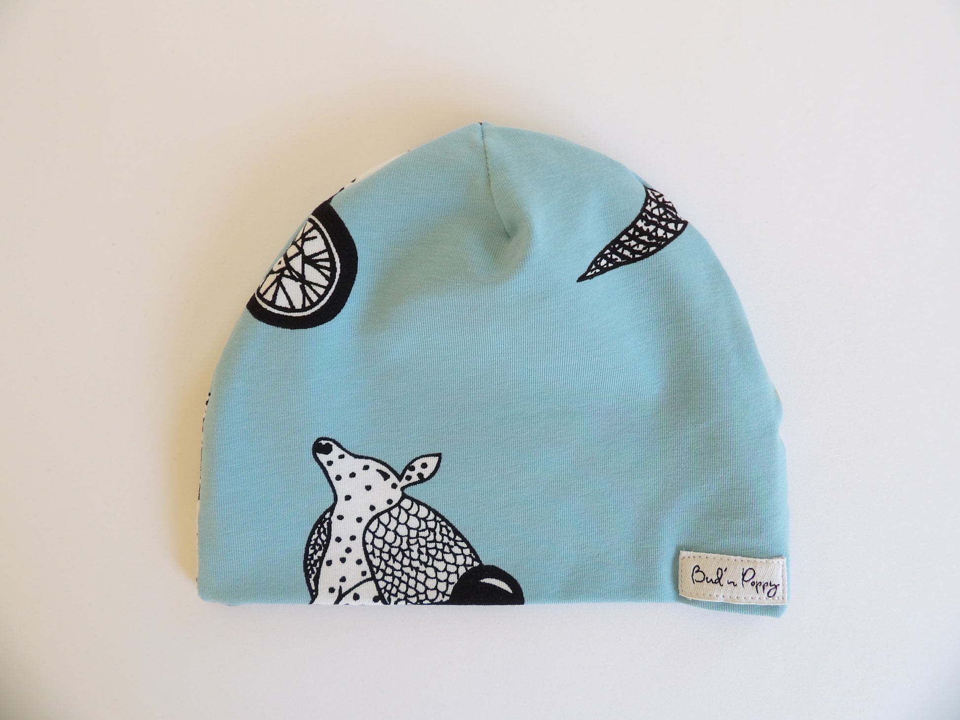 - En mössa i dubbelt trikåtyg, storlek 40/42 (strl 56). Mössan är tillverkad i samma tyg som växa-byxorna. Det rekommenderas att nyfödda har mössa ute året runt och en mössa var därför ett enkelt och självklart val som en del av Bud´n Poppys Originalset.