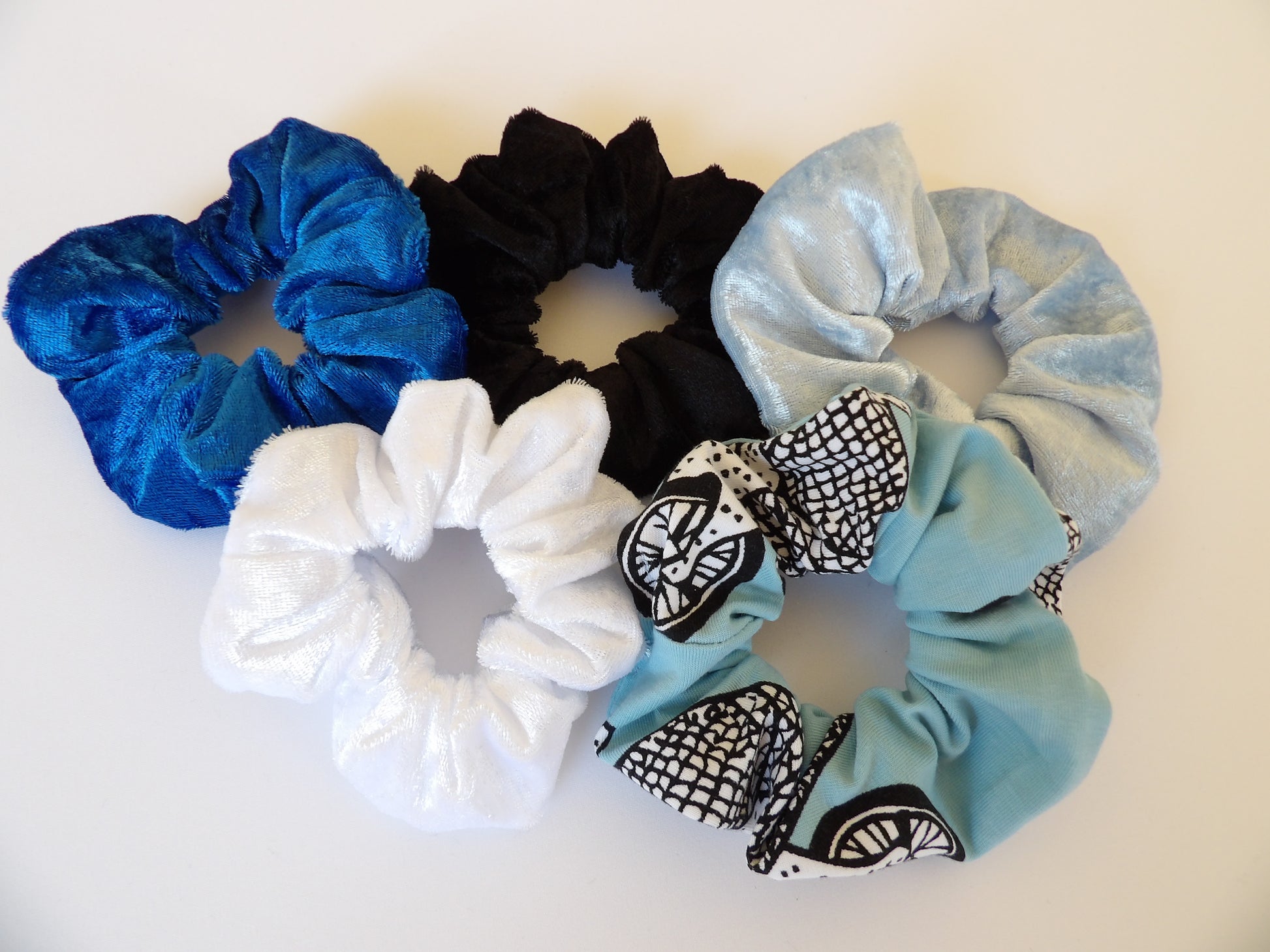 - Fyra scrunchies till vuxen i velourtyg i olika färger, där färgerna är noggrant utvalda för att matcha det kompletta setet.