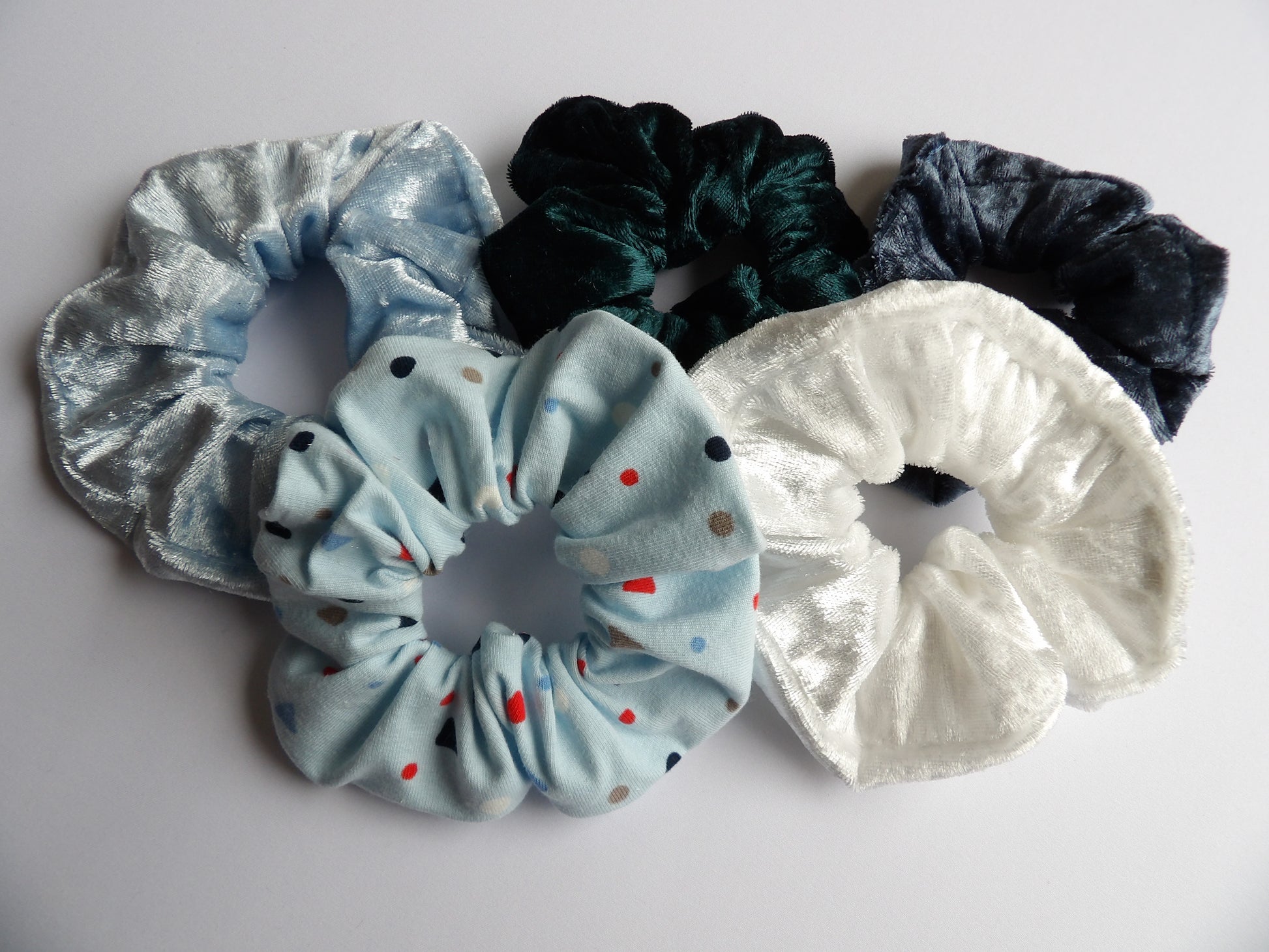 - Fyra scrunchies till vuxen i velourtyg i olika färger, där färgerna är noggrant utvalda för att matcha det kompletta setet.