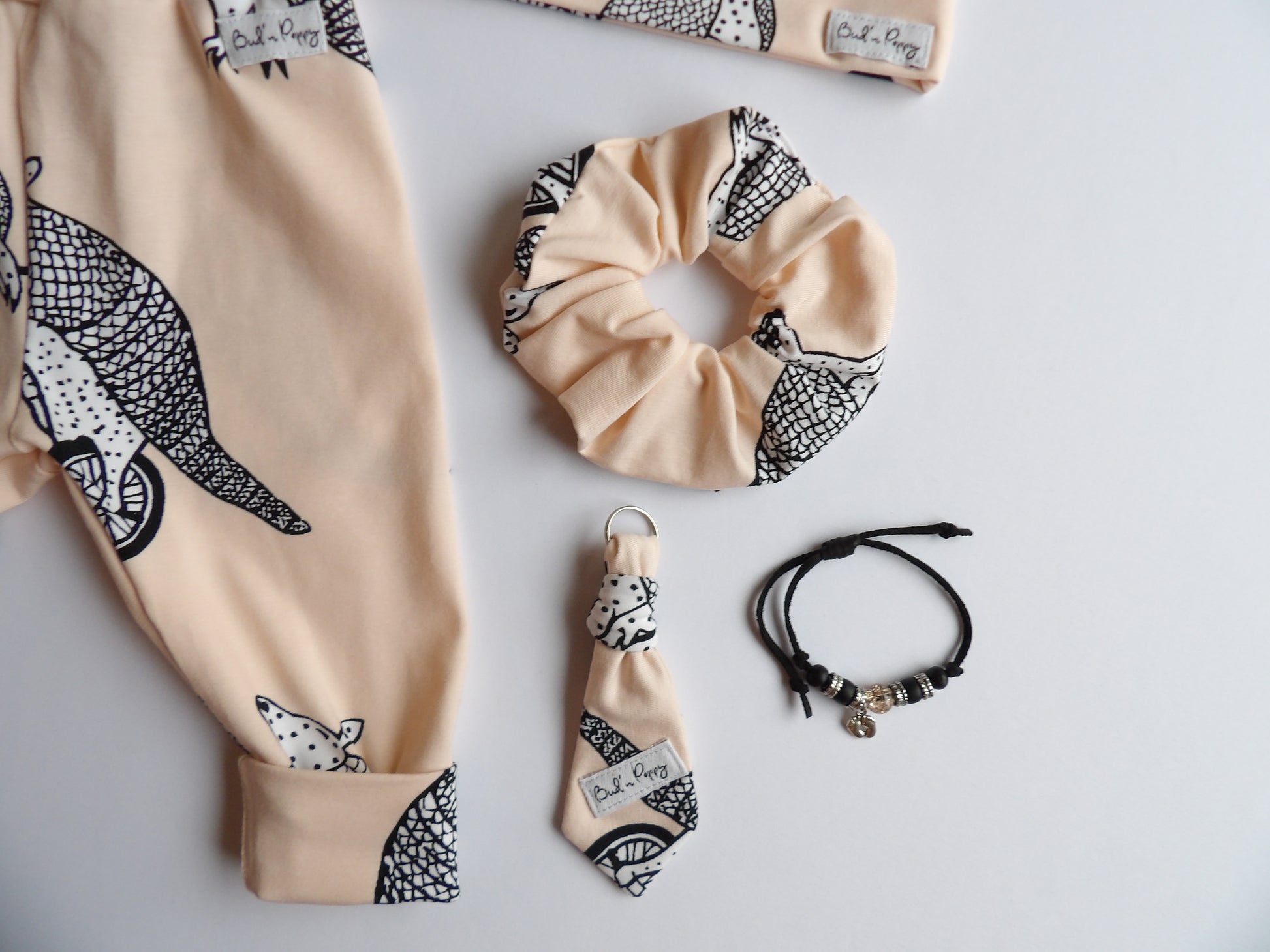 - En matchande scrunchie till vuxen i samma mjuka trikåtyg som babykläderna.