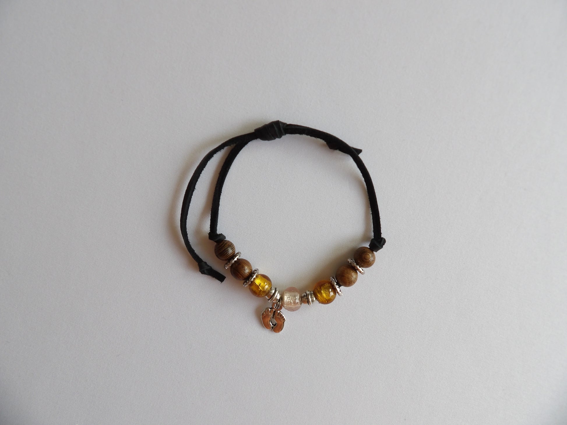 Material band: Äkta hjortskinn (laskrem). Material pärlor, mellandelar och berlock: Trä, metall, glas och rostfritt stål. Skötselråd: Torkas av med fuktig trasa.