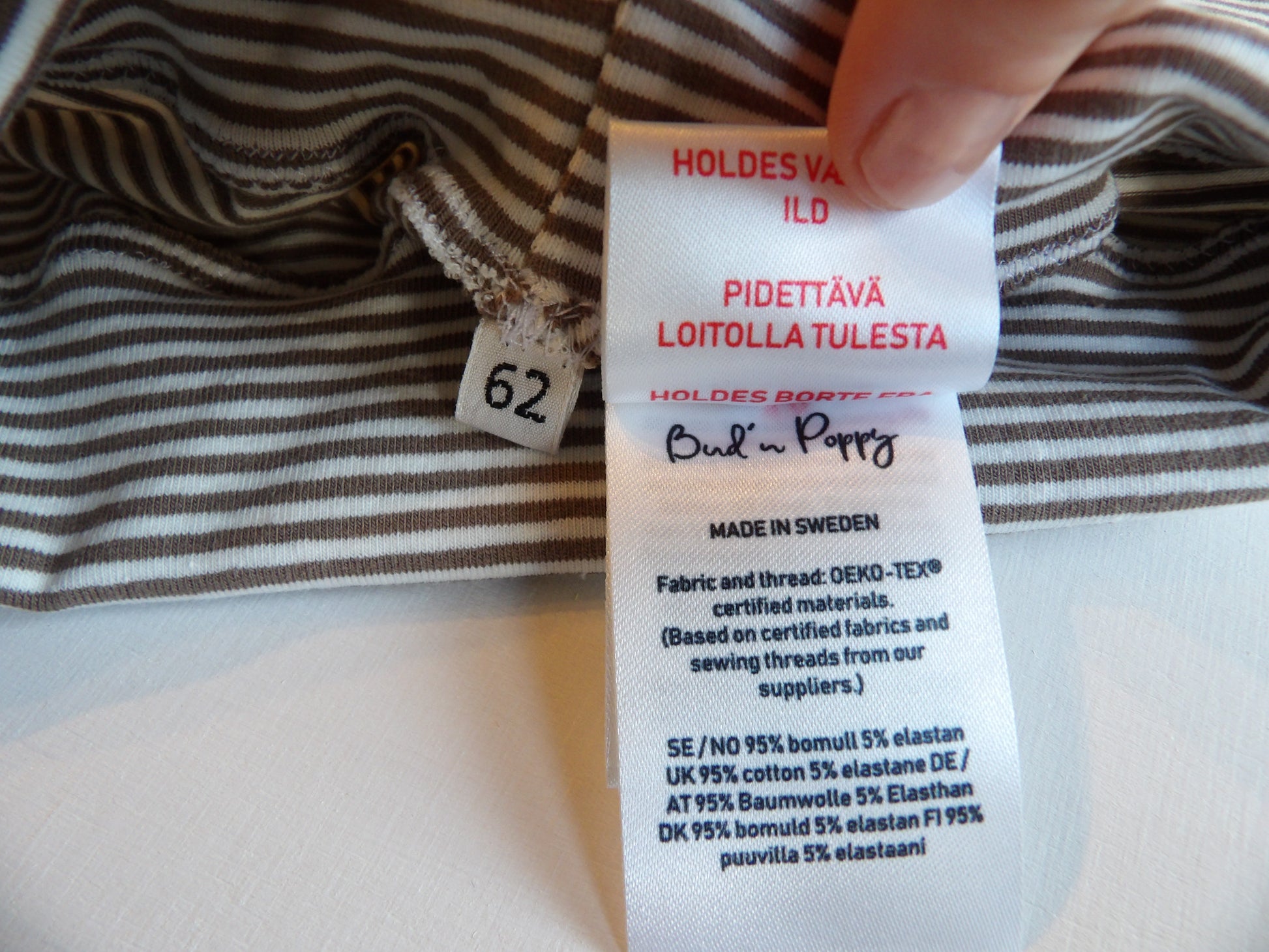 Varje byxa är handgjord i Sverige och sydd av OEKO-TEX®-certifierade tyger, fria från skadliga ämnen, skonsam mot barnets hud och vänlig mot naturen.