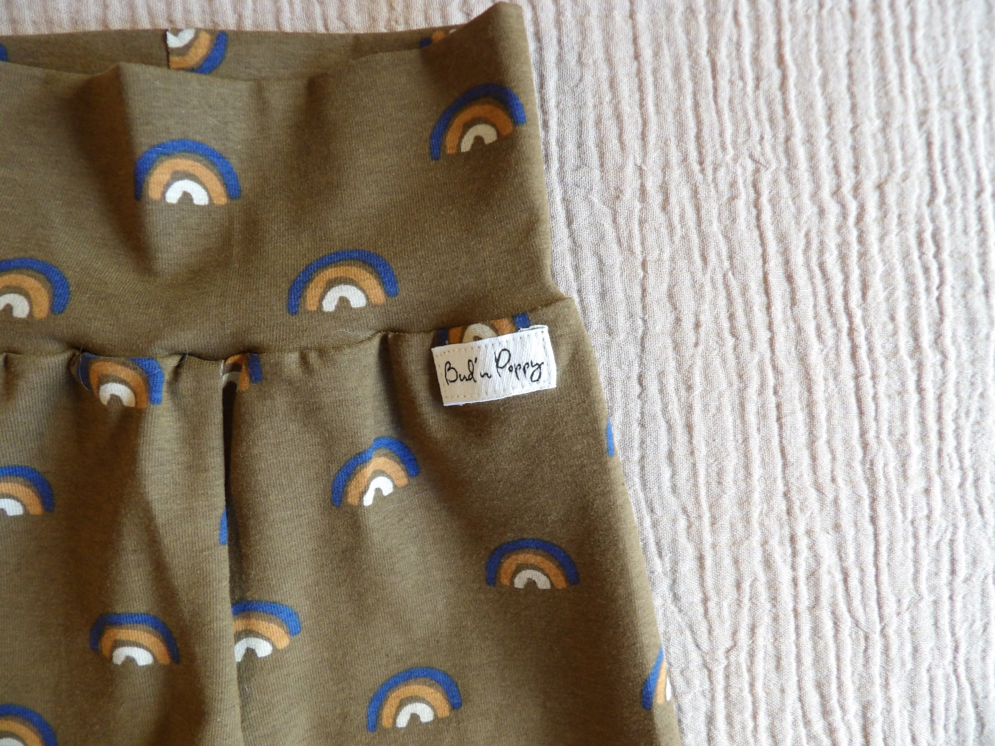 Bud’n Poppys växa-byxor är sydda i mjuk trikå som formar sig efter barnets rörelser och växer med barnet.